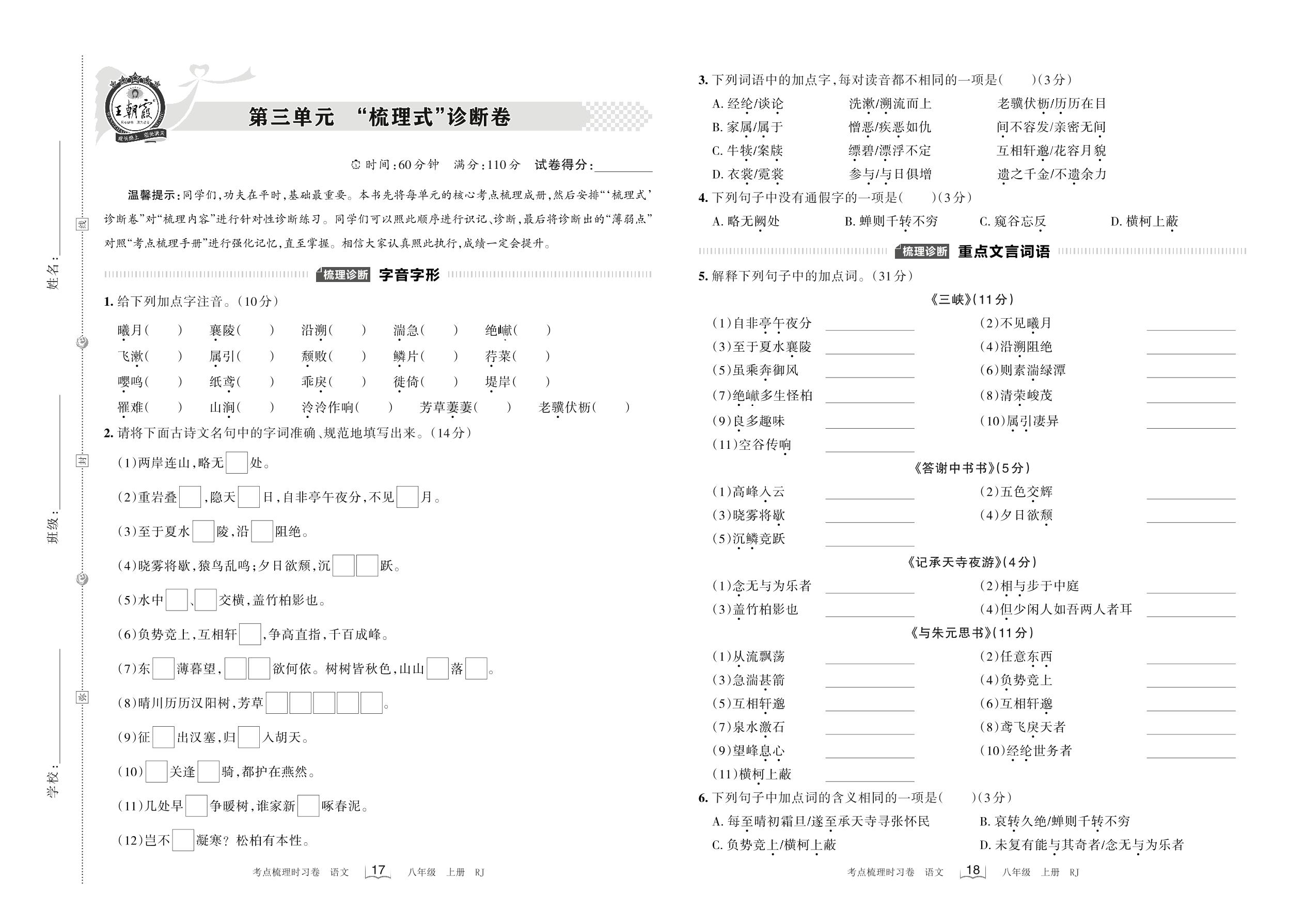 2022上册八年级语文人教版 第三单元 “梳理式”诊断卷