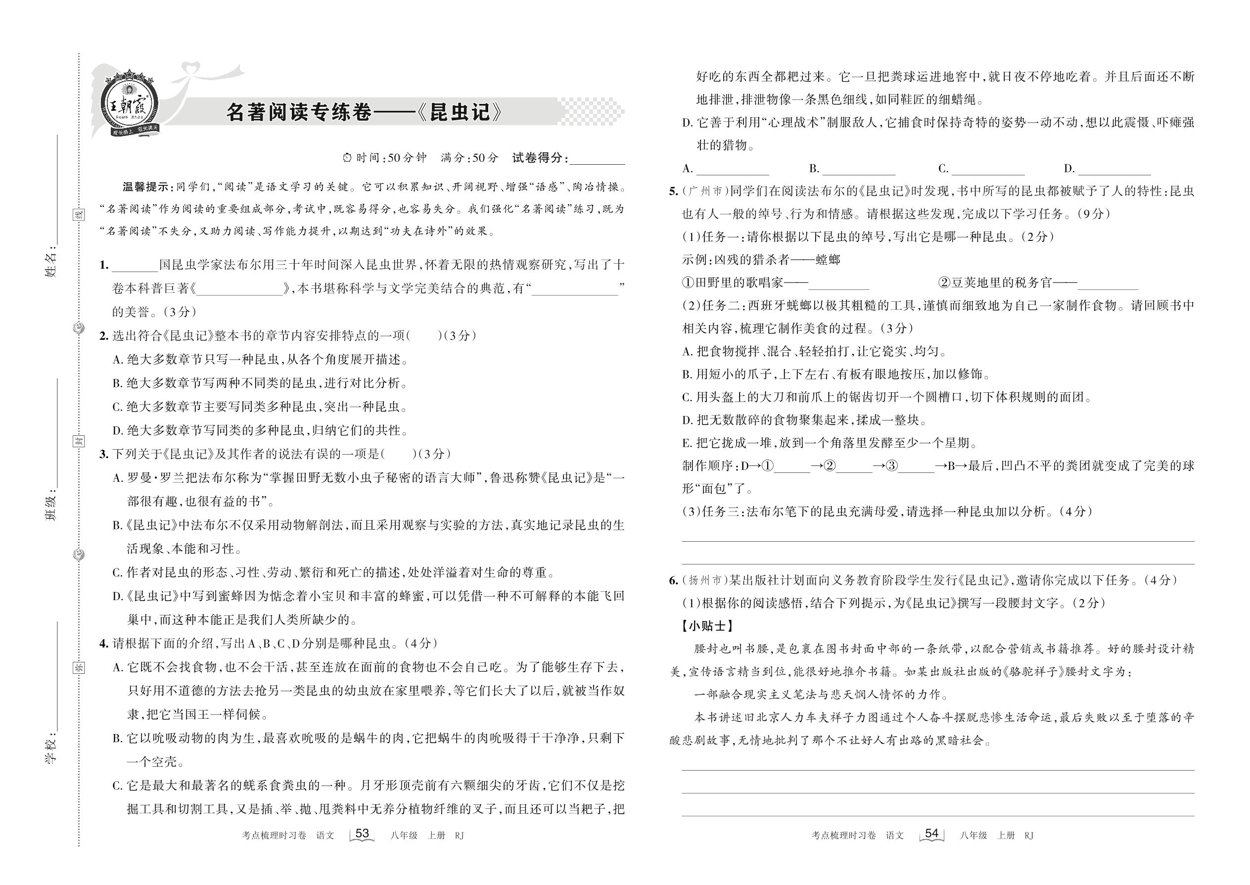 2022上册八年级语文人教版 名著阅读专练卷——《昆虫记》