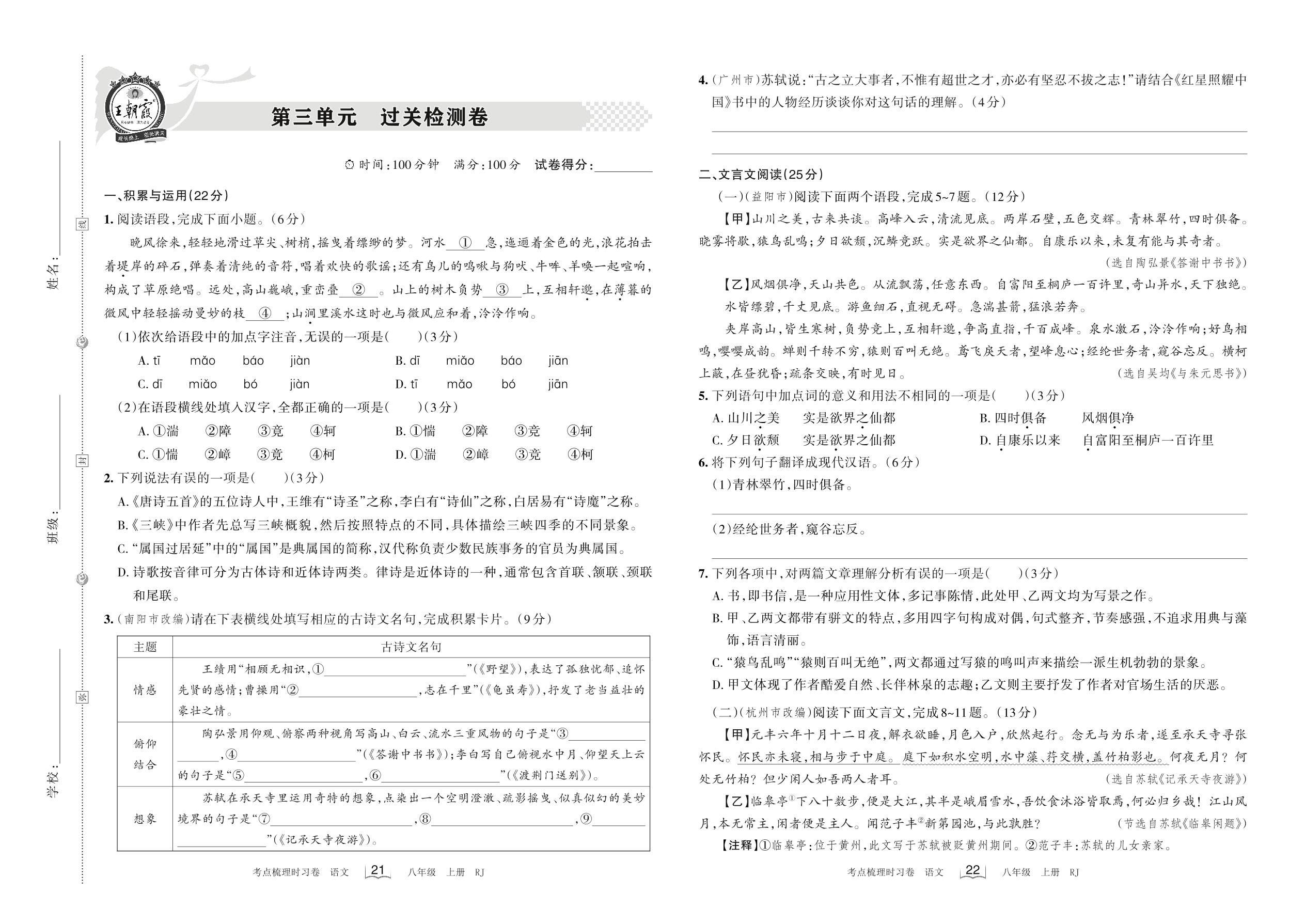 2022上册八年级语文人教版 第三单元 过关检测卷