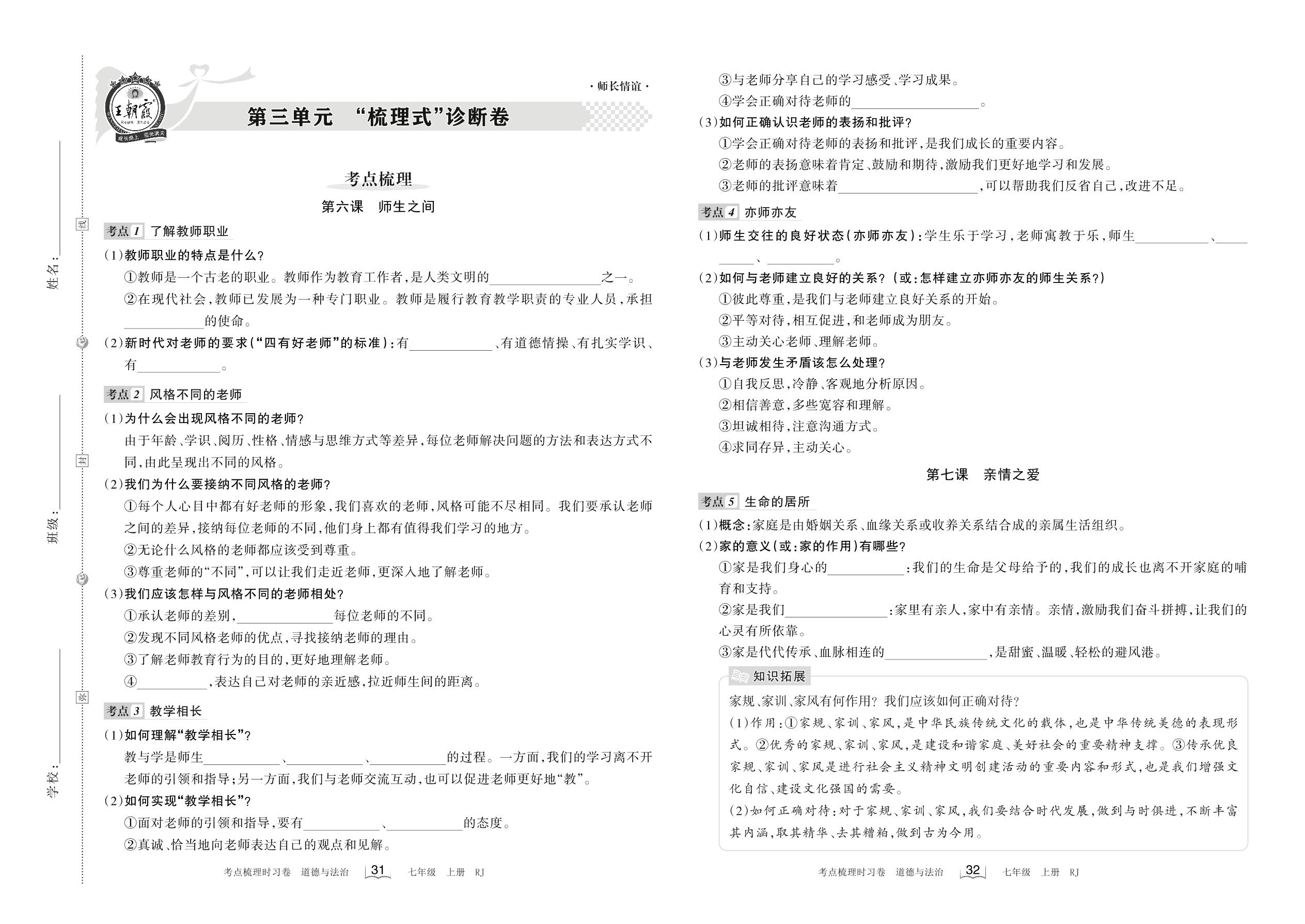2022上册七年级道德与法治人教版 第三单元 “梳理式”诊断卷