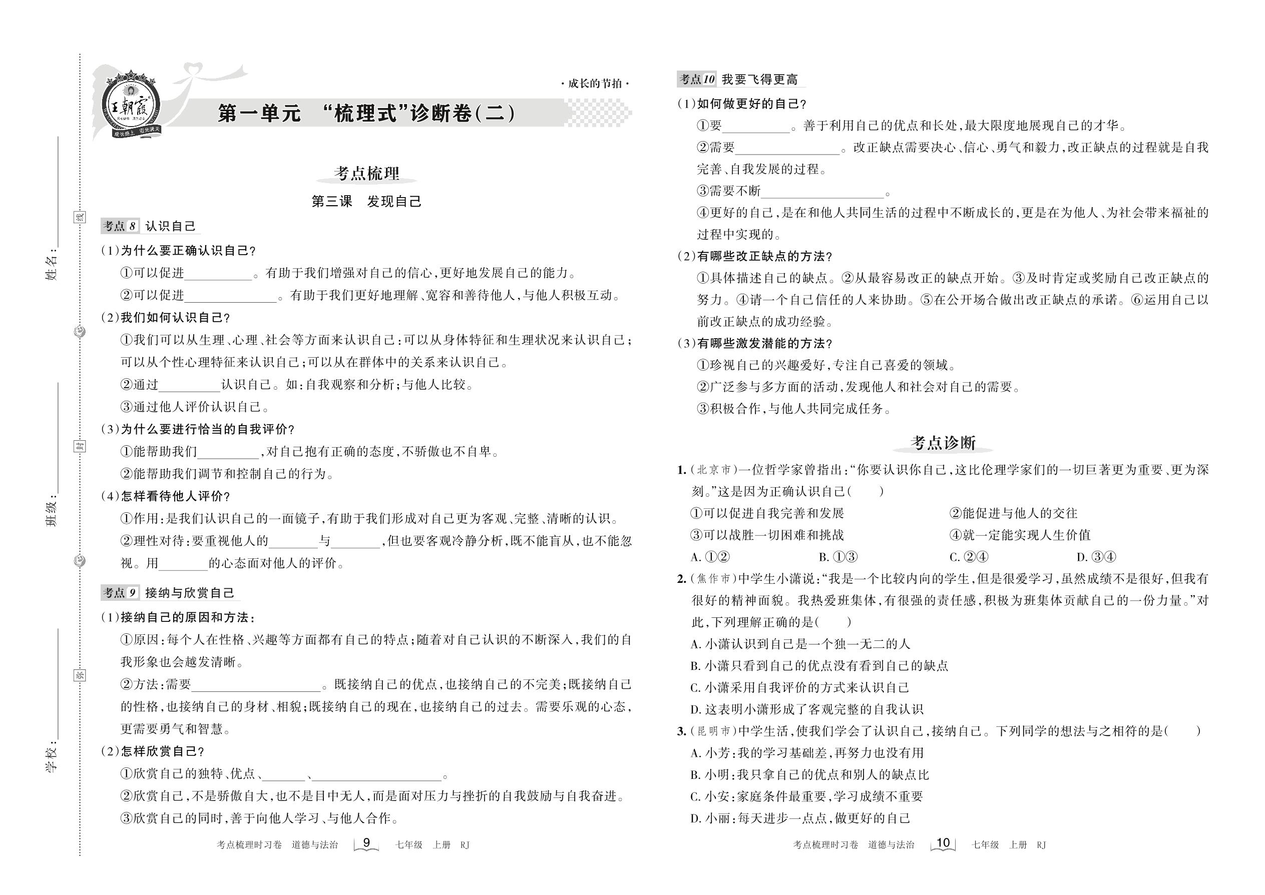 2022上册七年级道德与法治人教版 第一单元 “梳理式”诊断卷(二)
