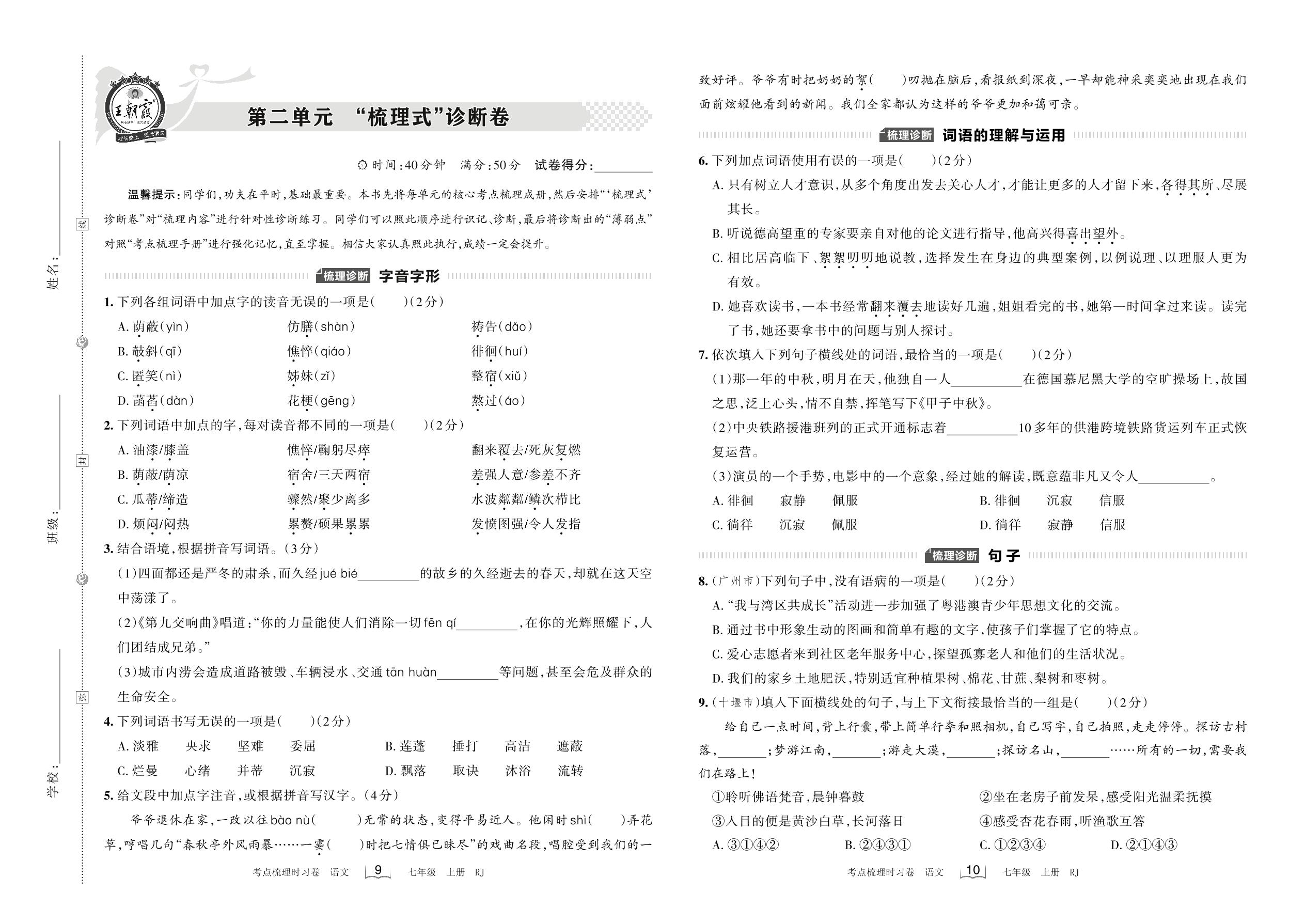 2022上册七年级语文人教版 第二单元 “梳理式”诊断卷