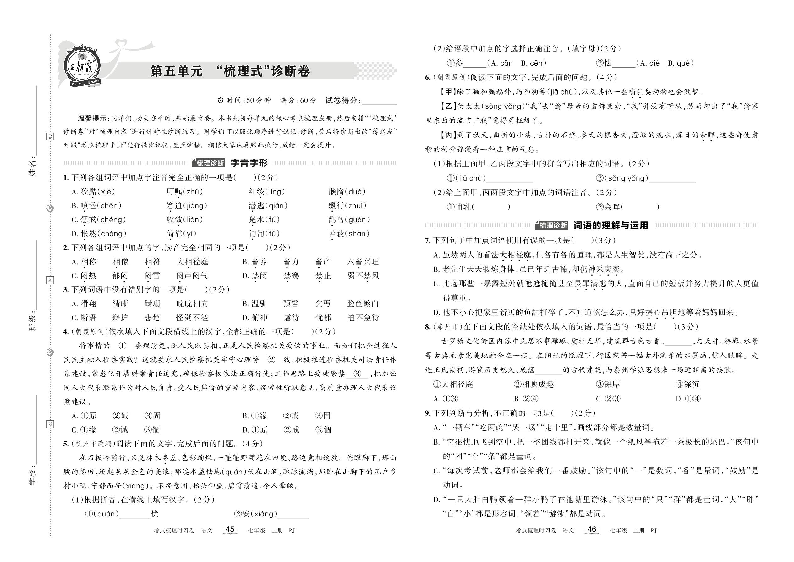 2022上册七年级语文人教版 第五单元 “梳理式”诊断卷