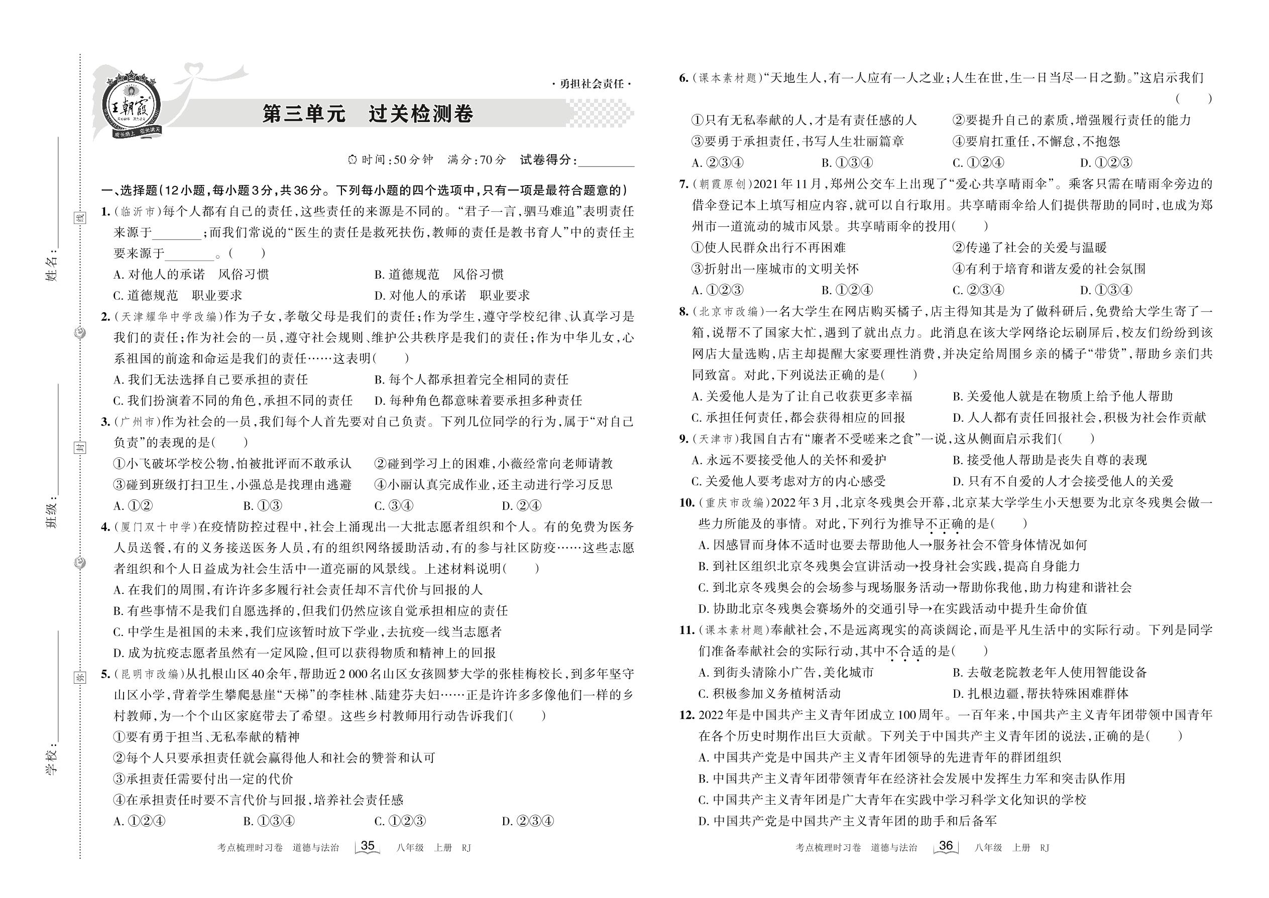 2022上册八年级道德与法治人教版 第三单元 过关检测卷