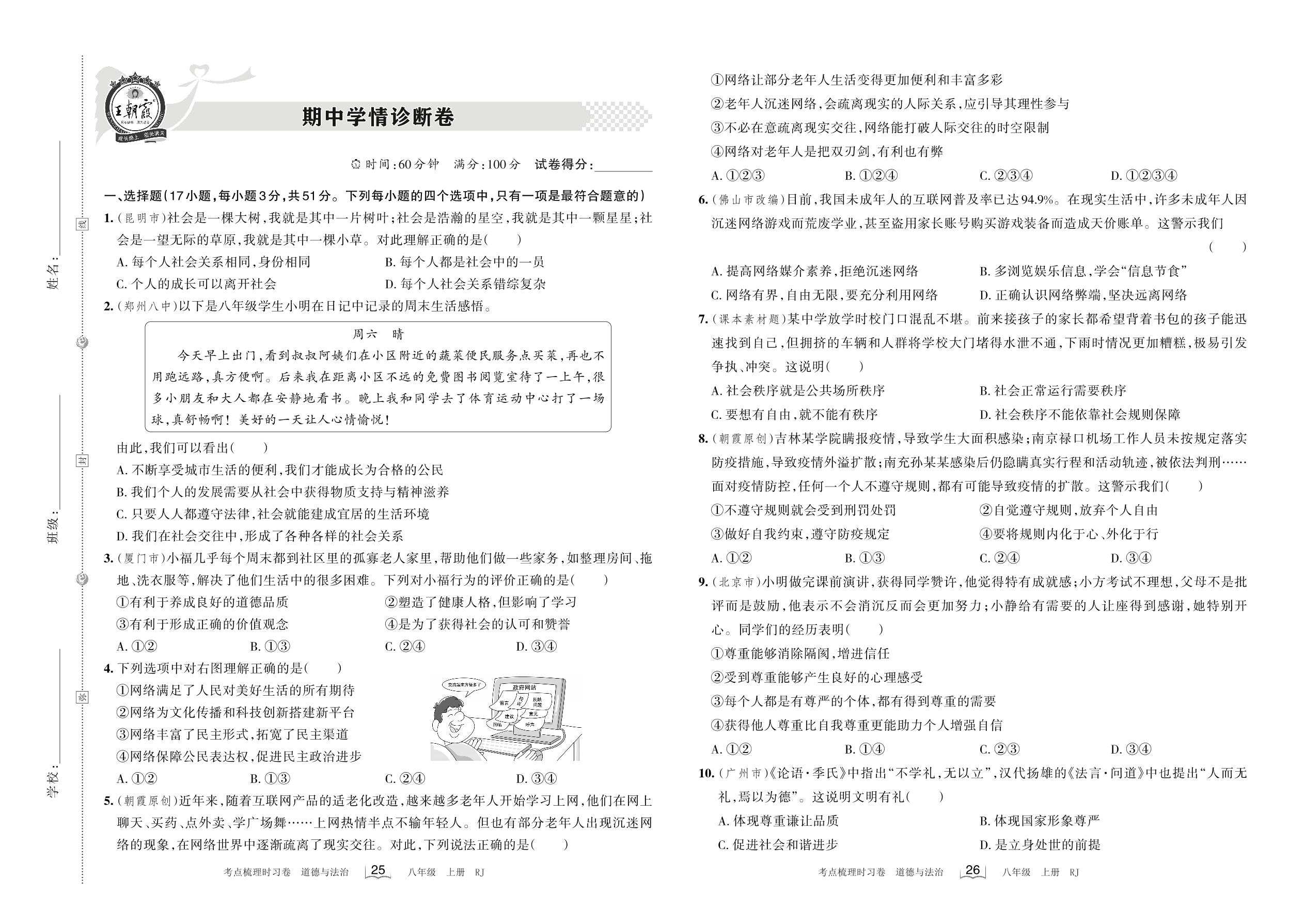 2022上册八年级道德与法治人教版 期中学情诊断卷