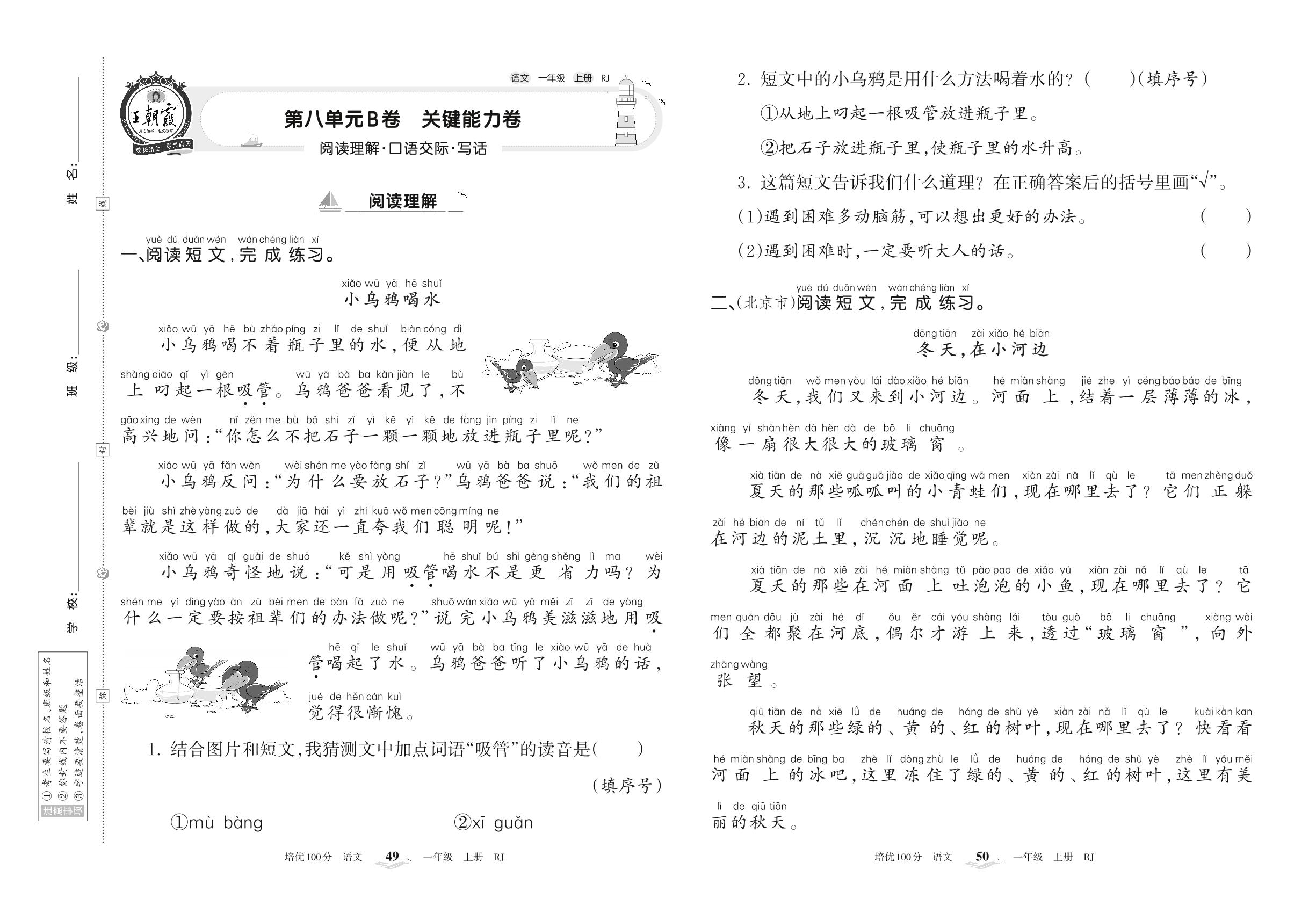 2022上册一年级语文人教版 第八单元B卷 关键能力卷