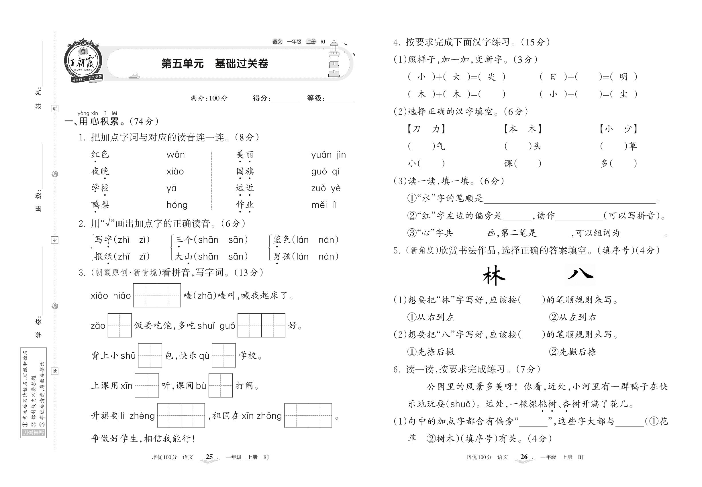 2022上册一年级语文人教版 第五单元 基础过关卷