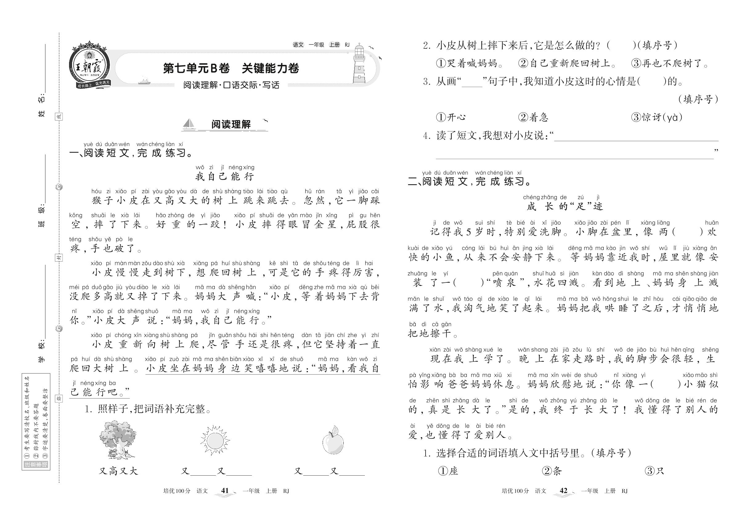 2022上册一年级语文人教版 第七单元B卷 关键能力卷