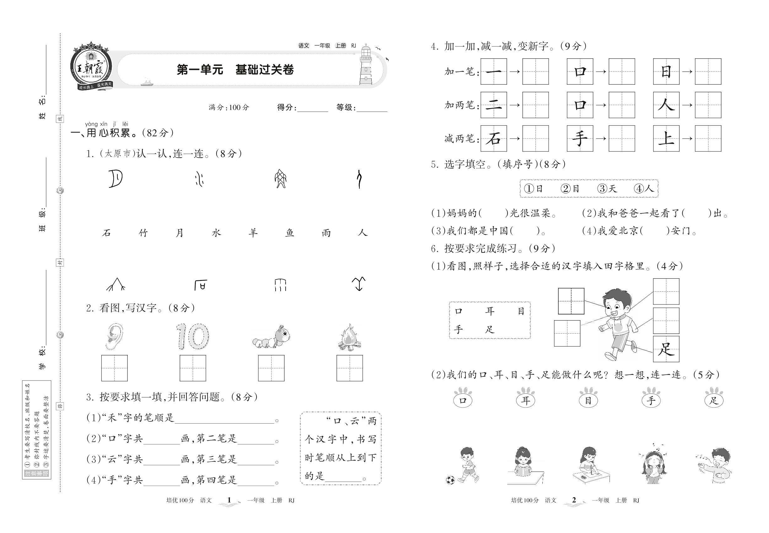 2022上册一年级语文人教版 第一单元 基础过关卷