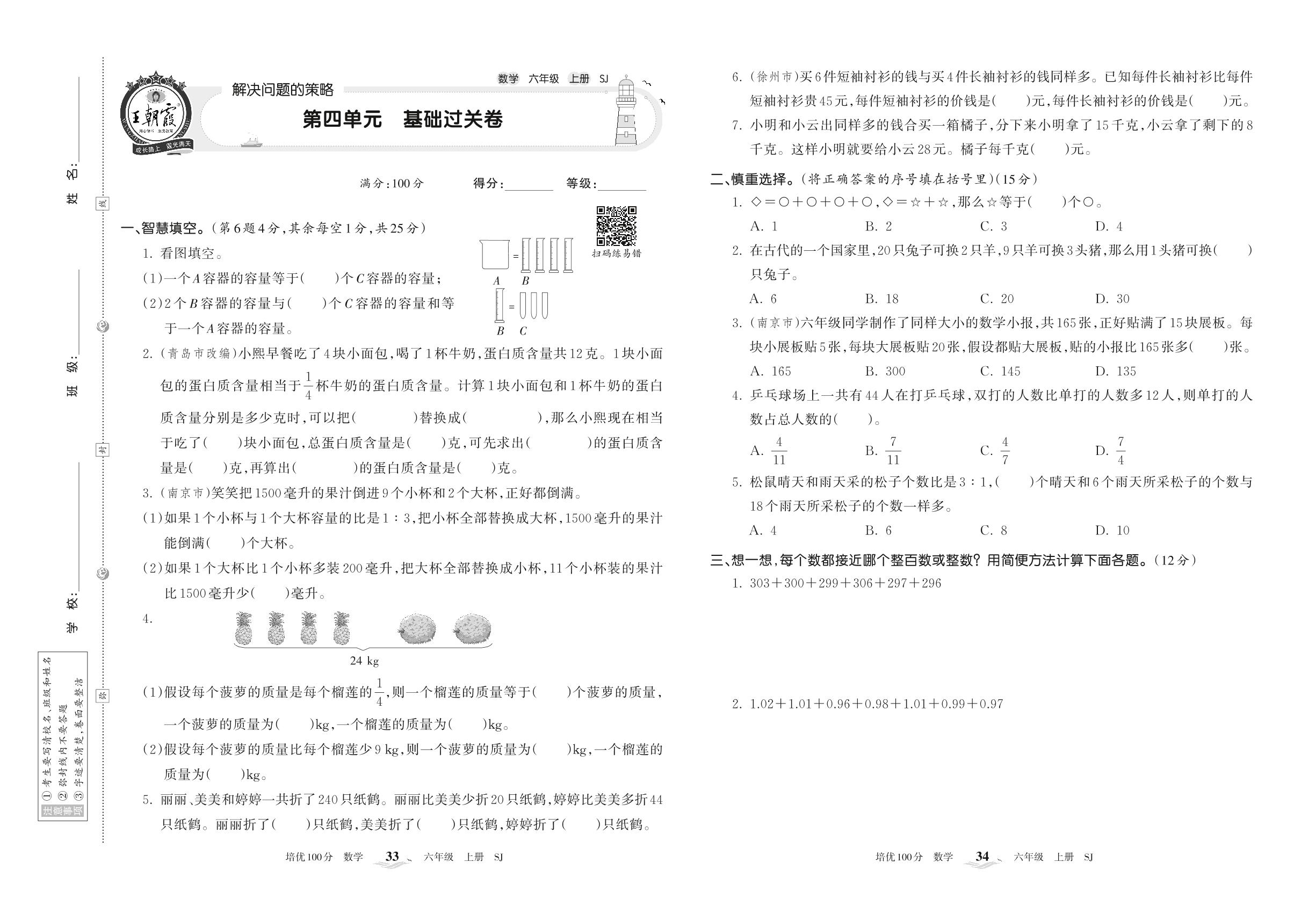 2022上册六年级数学苏教版 第四单元 基础过关卷