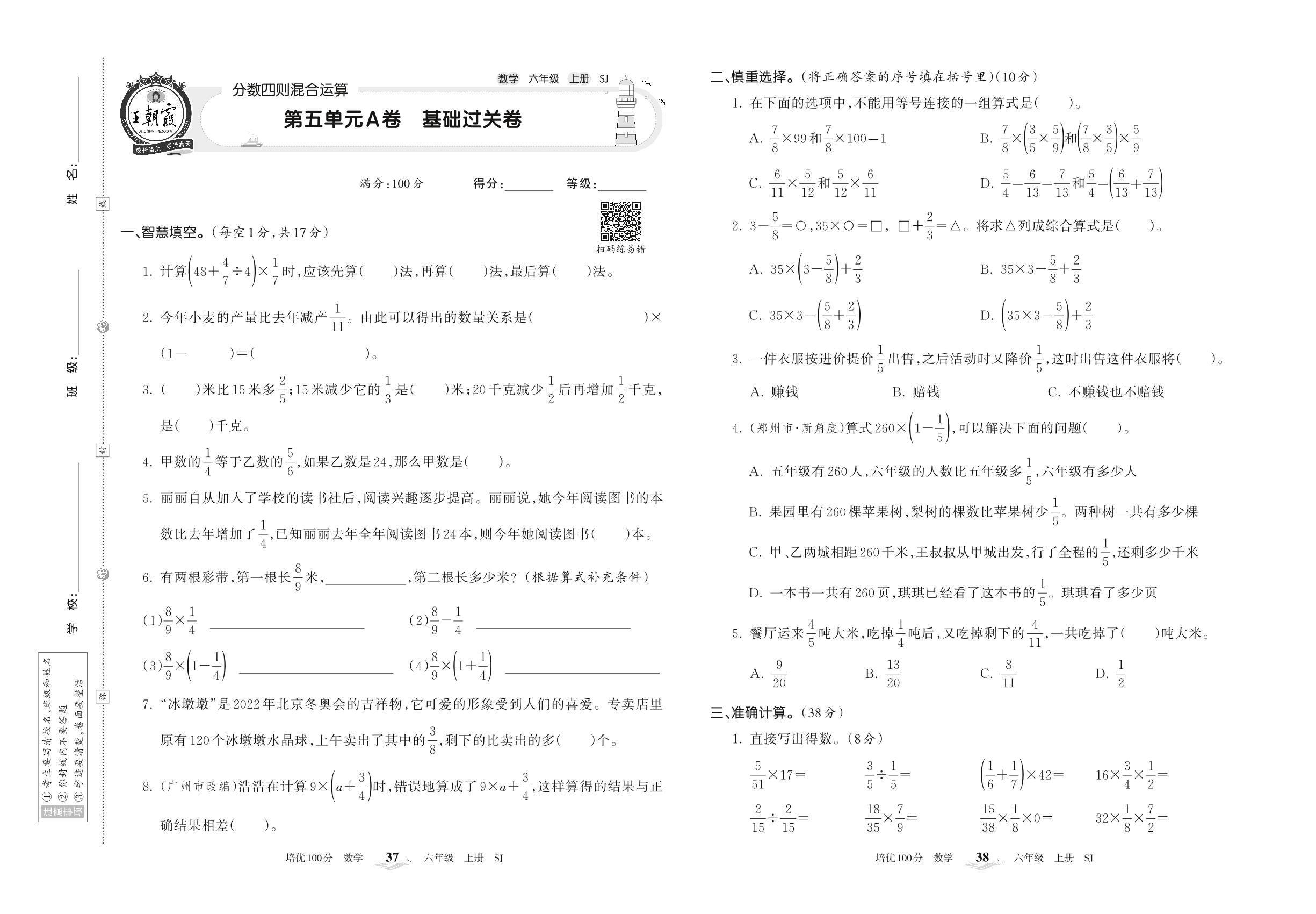 2022上册六年级数学苏教版 第五单元A卷 基础过关卷