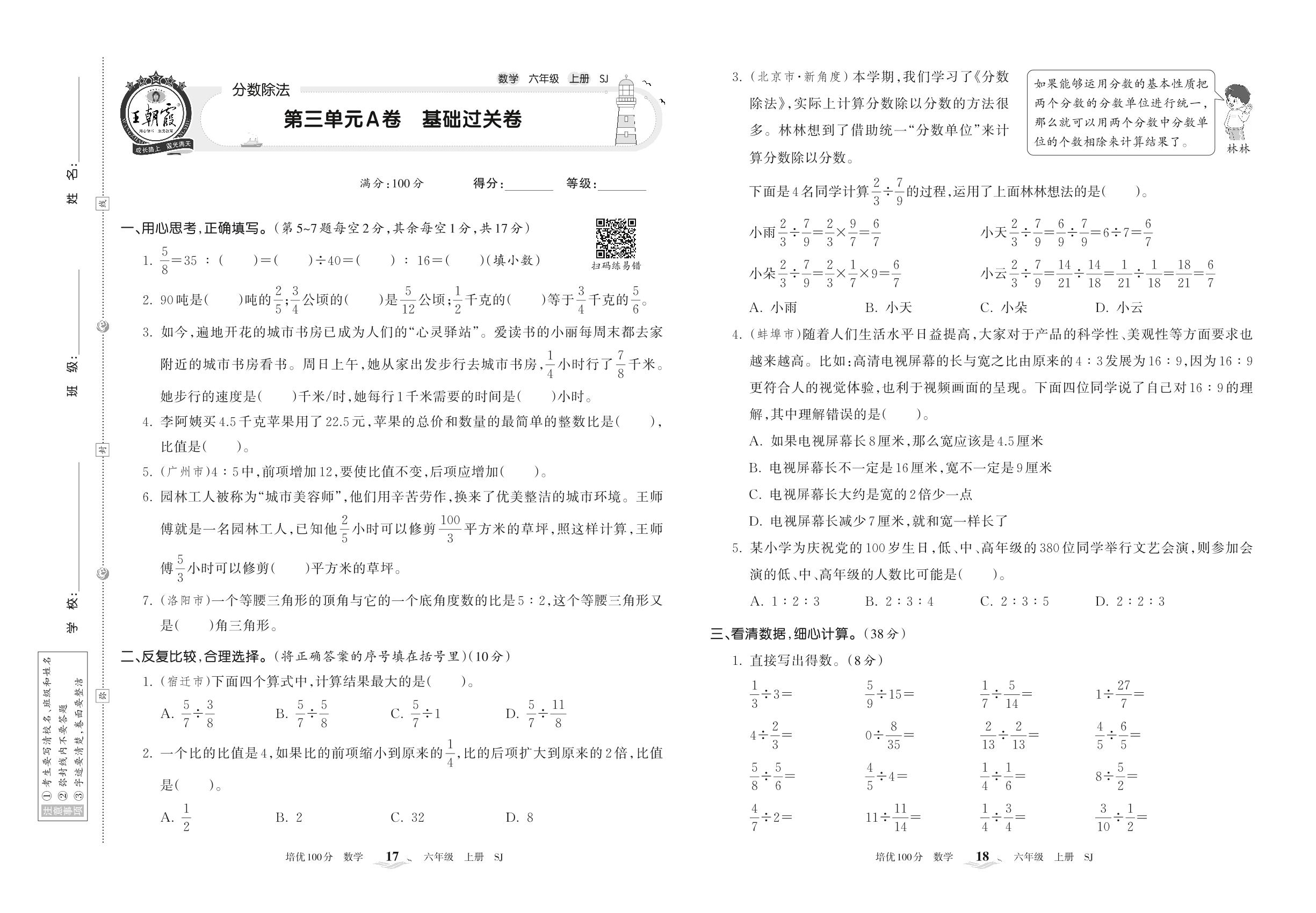 2022上册六年级数学苏教版 第三单元A卷 基础过关卷
