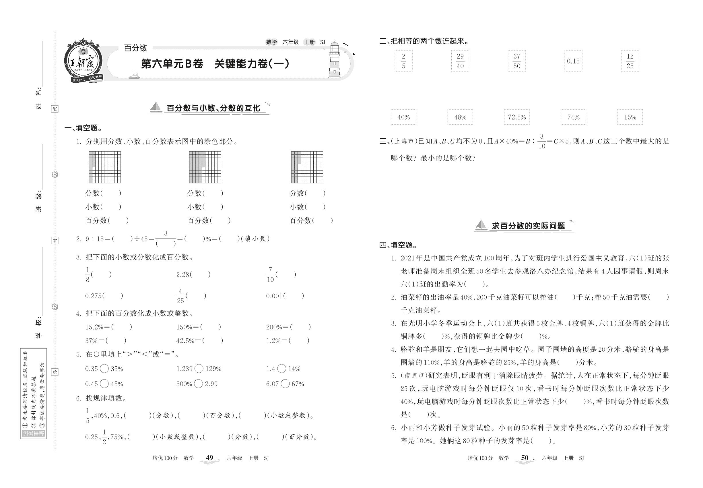 2022上册六年级数学苏教版 第六单元B卷 关键能力卷(一)