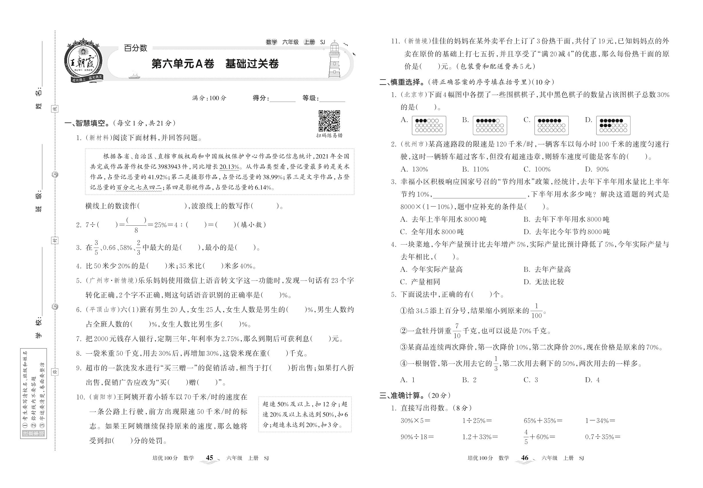 2022上册六年级数学苏教版 第六单元A卷 基础过关卷