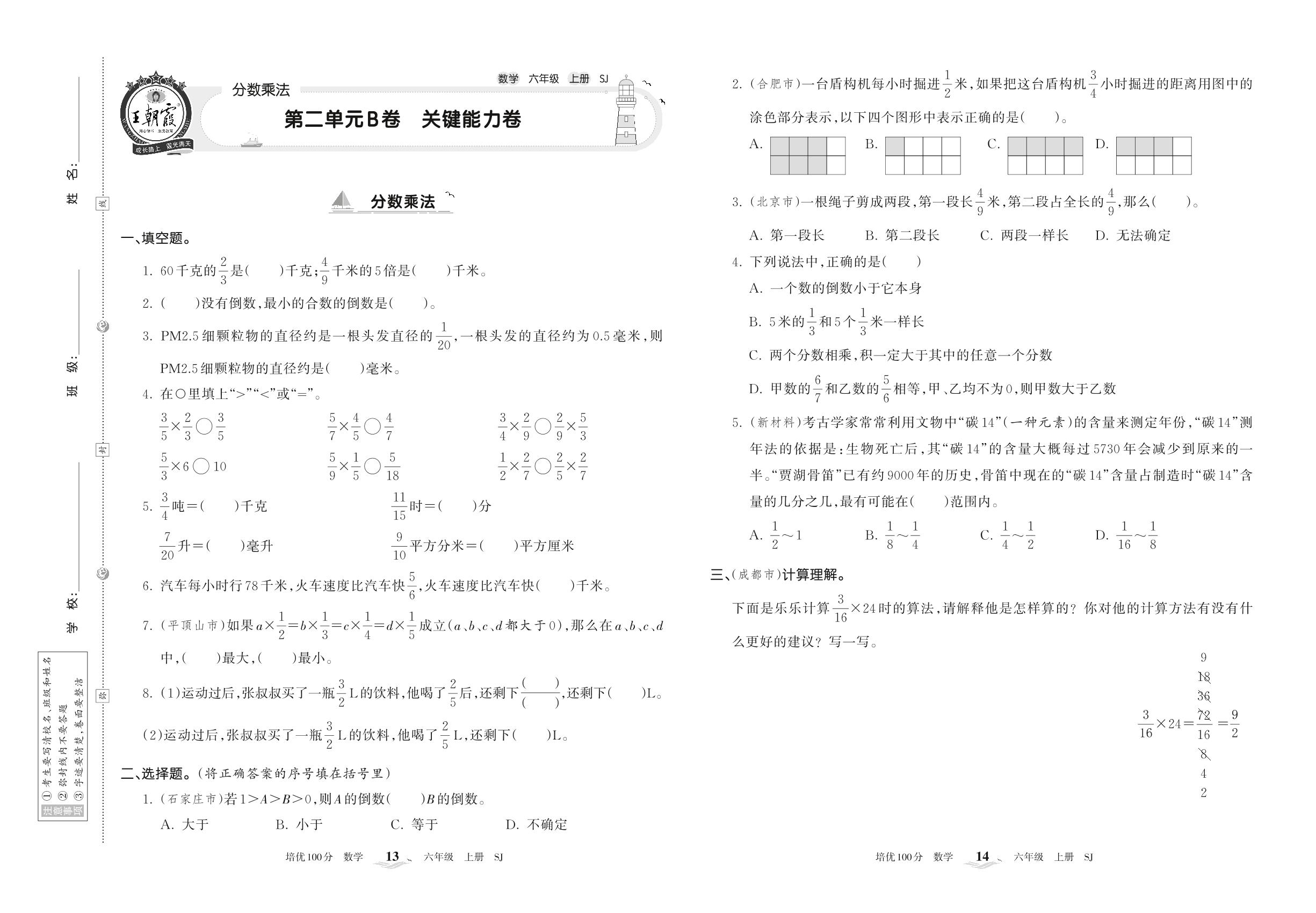 2022上册六年级数学苏教版 第二单元B卷 关键能力卷
