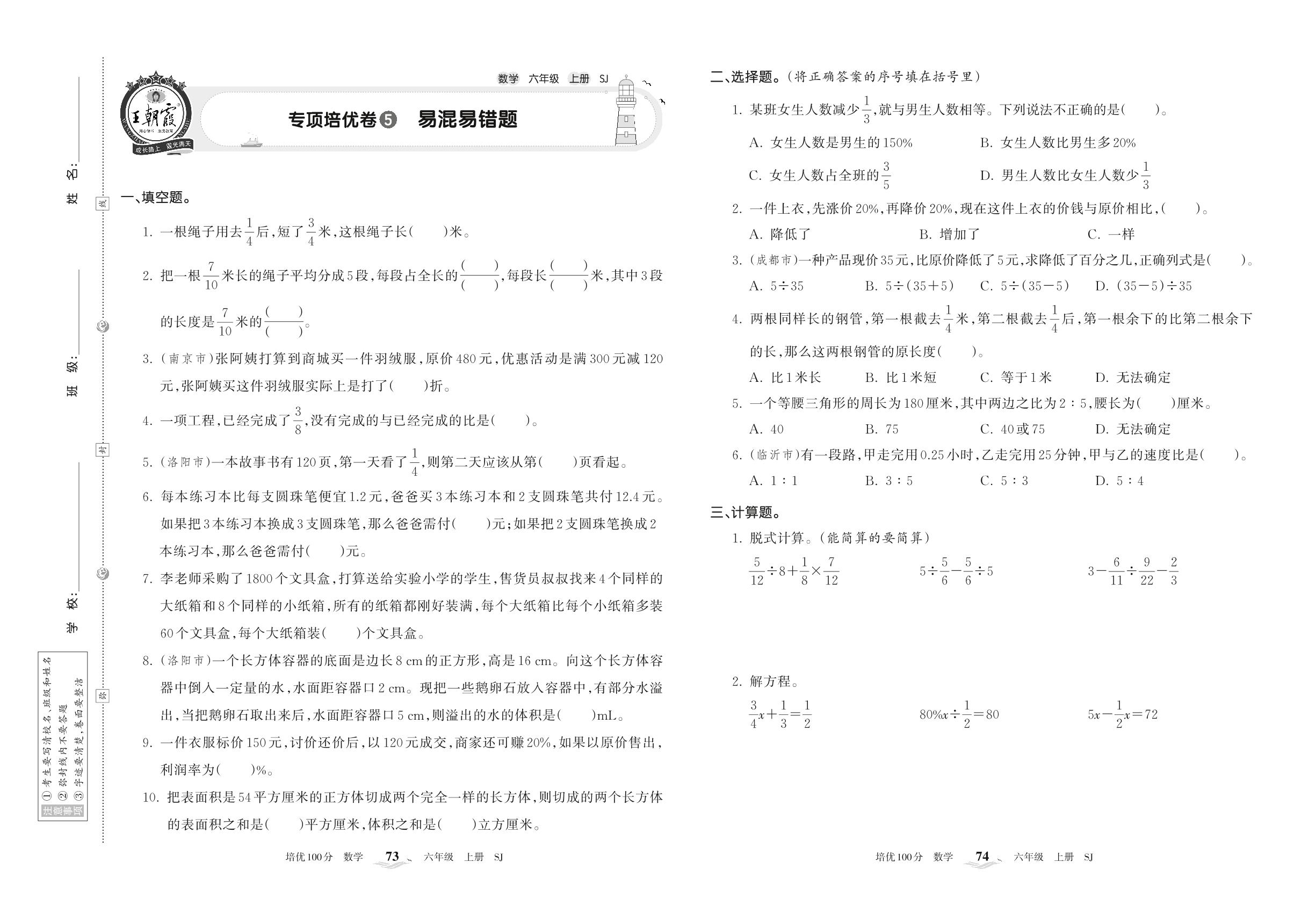 2022上册六年级数学苏教版 专项培优卷5 易混易错题