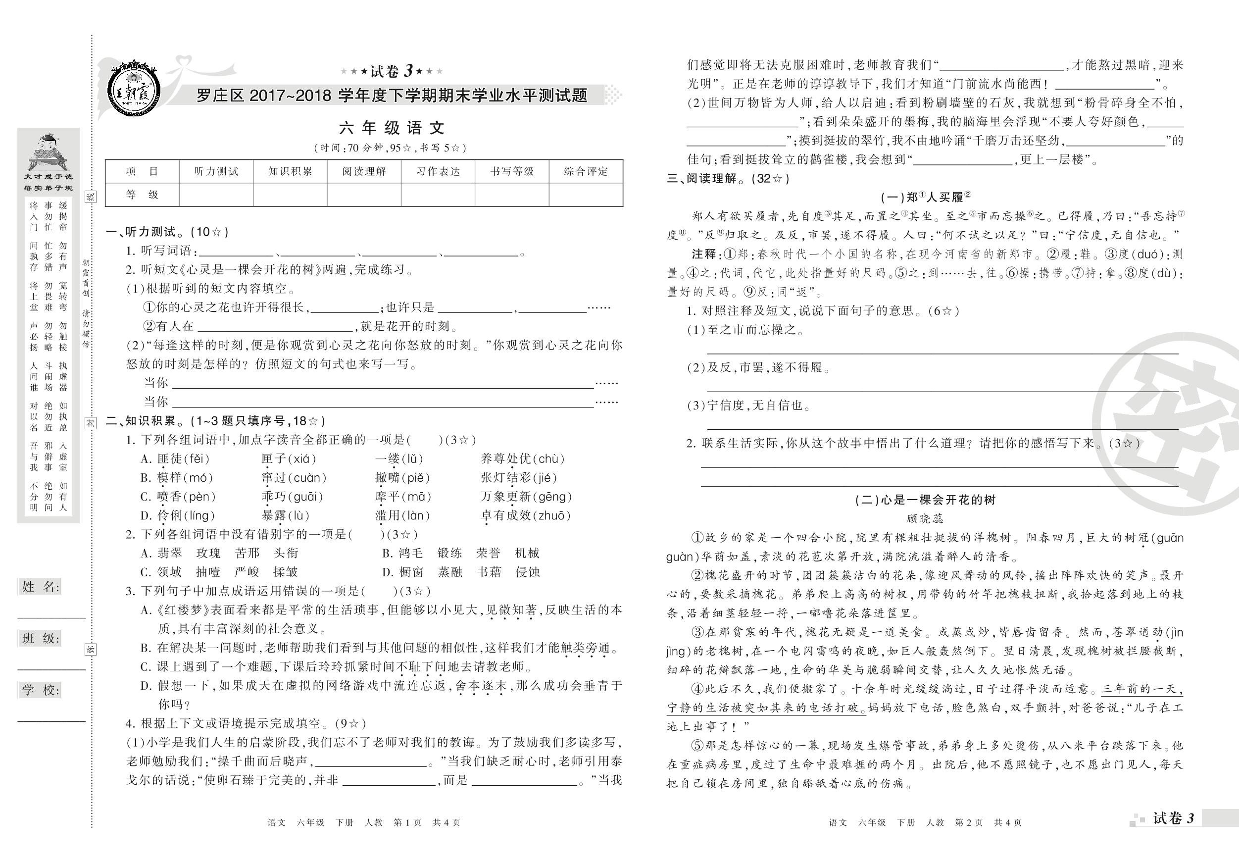 2017-2018学年第二学期临沂市罗庄区六年级语文试卷(人教版)【3】