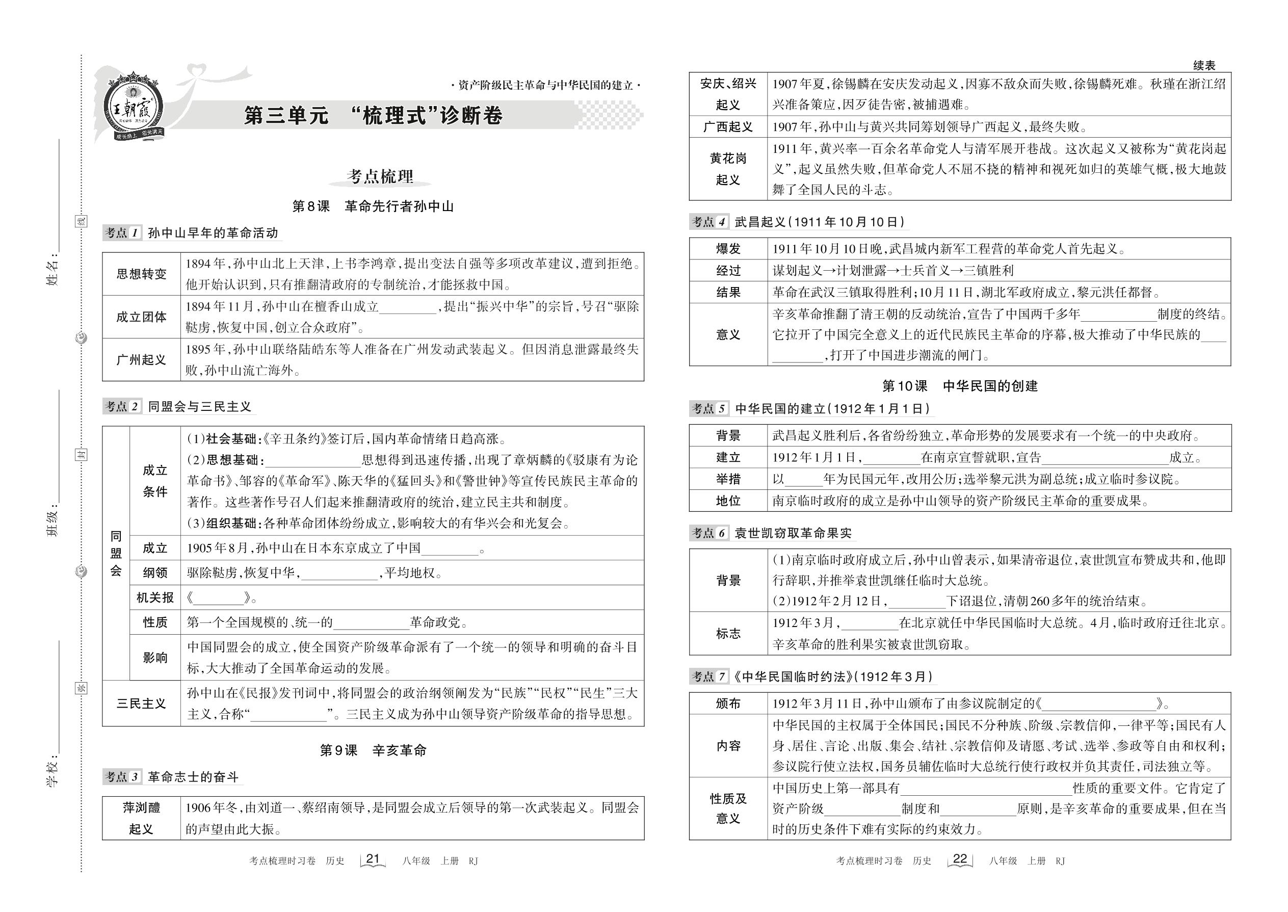 2022上册八年级历史人教版 第三单元 “梳理式”诊断卷