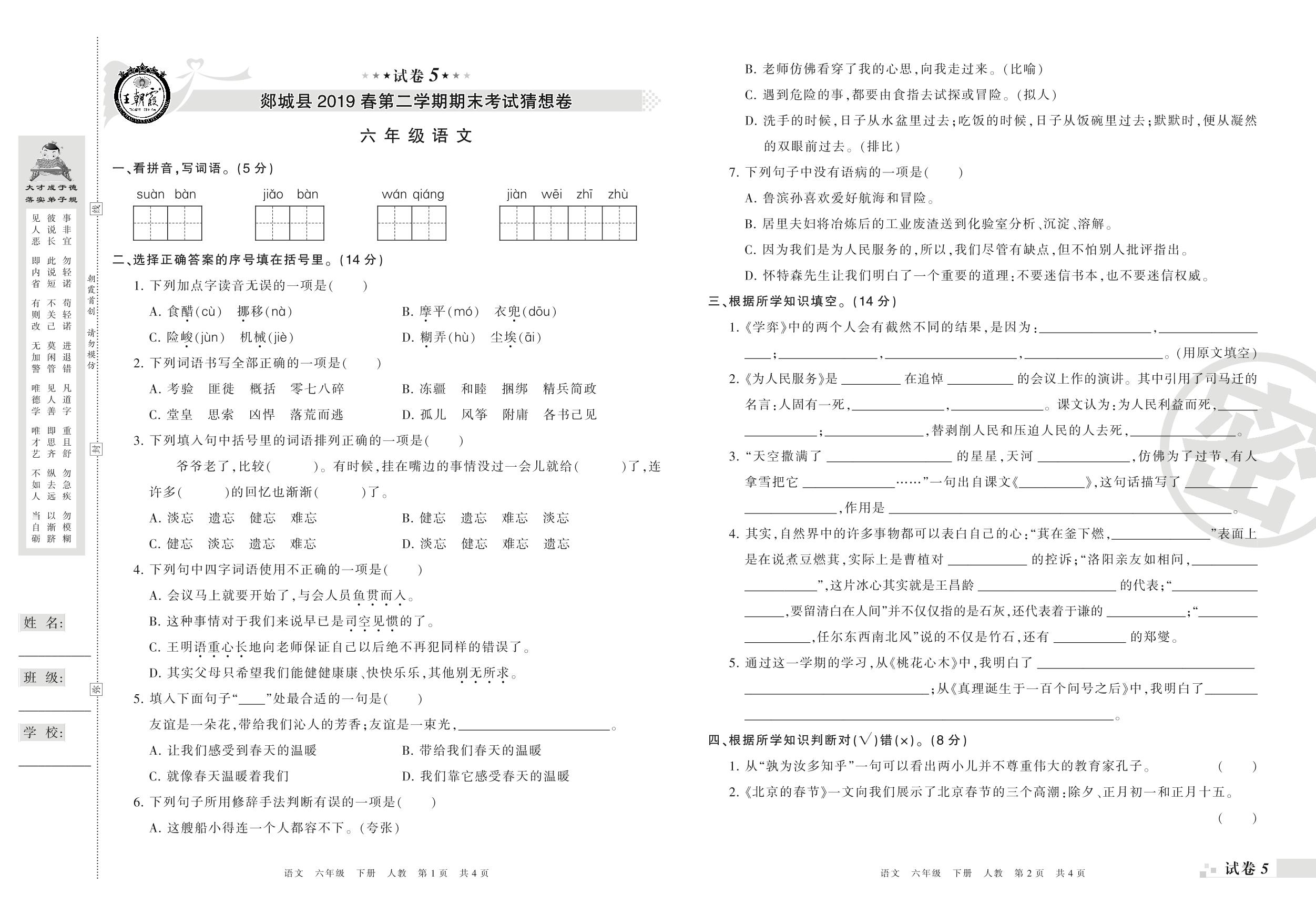 2018-2019学年第二学期临沂市郯城县猜想卷六年级语文试卷(人教版)【5】