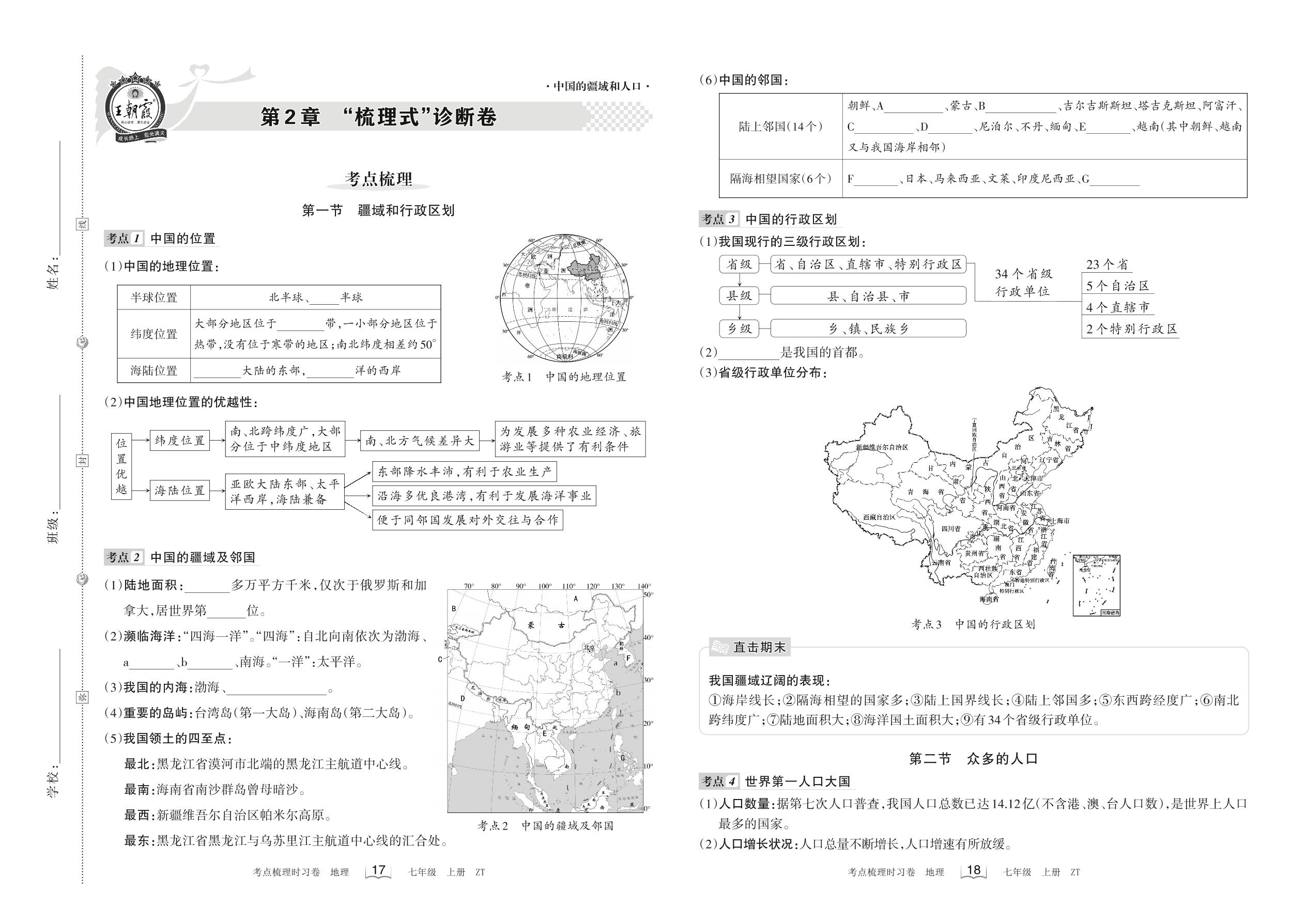 2022上册七年级地理中图版 第2章 “梳理式”诊断卷