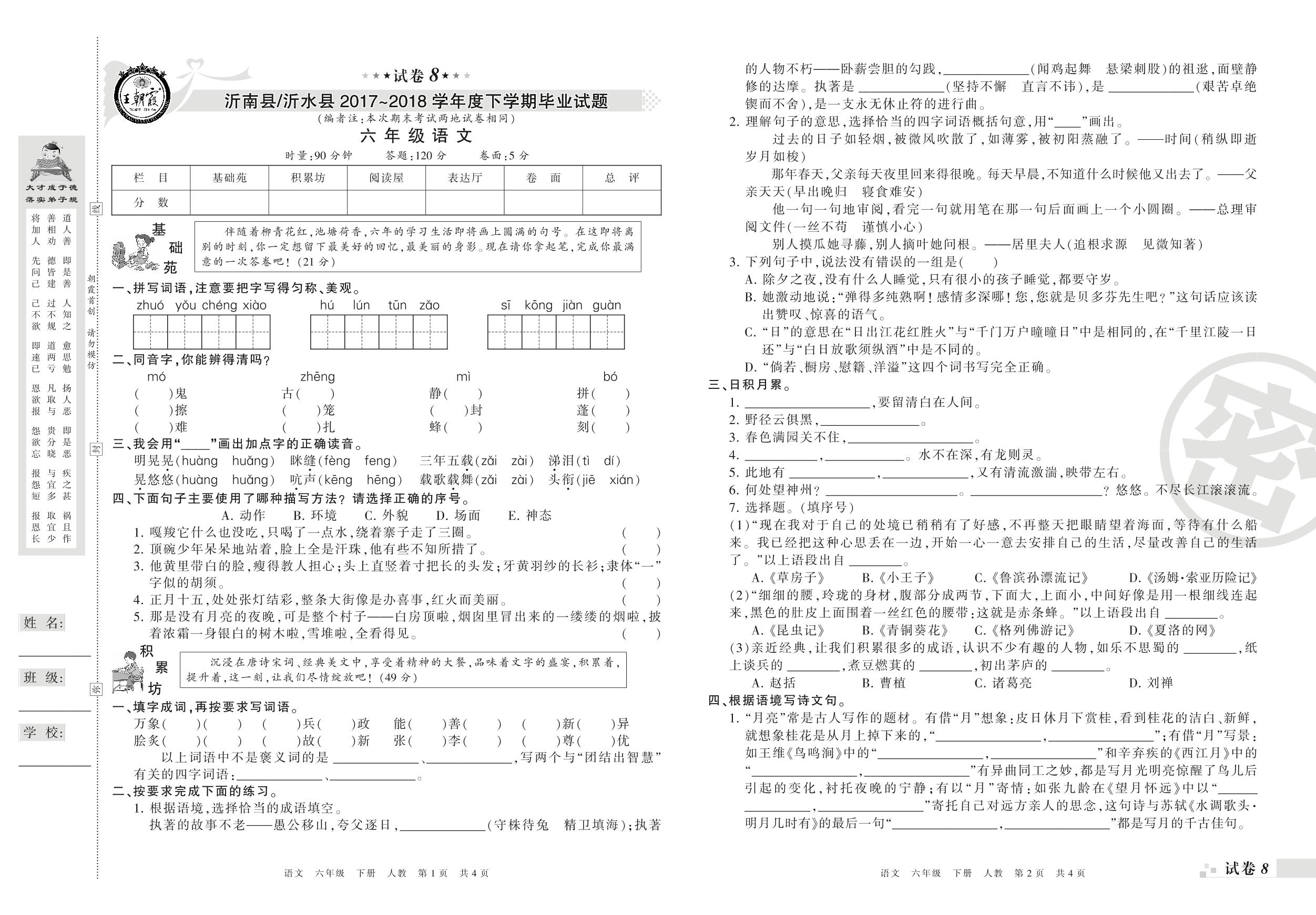 2017-2018学年第二学期临沂市沂南县、沂水县六年级语文试卷(人教版)【8】