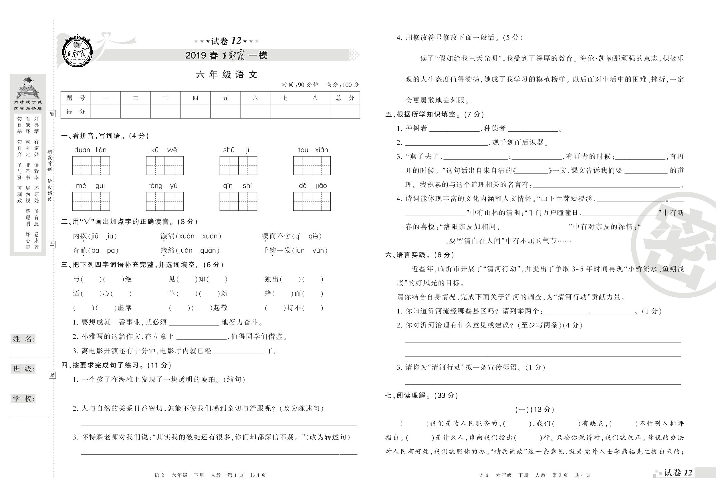王朝霞期末模拟卷六年级下册语文(人教版)【12】