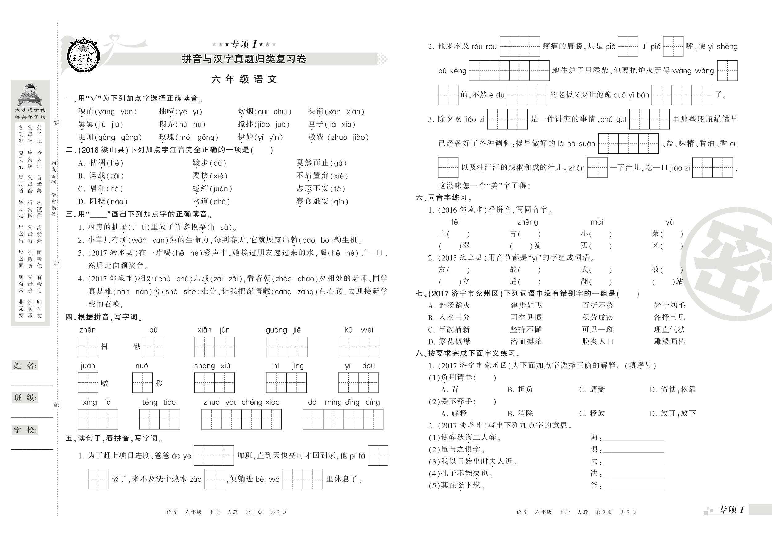 王朝霞期末专项卷——拼音与汉字、词语真题归类复习卷六年级下册语文(人教版)_R21080254222【0】