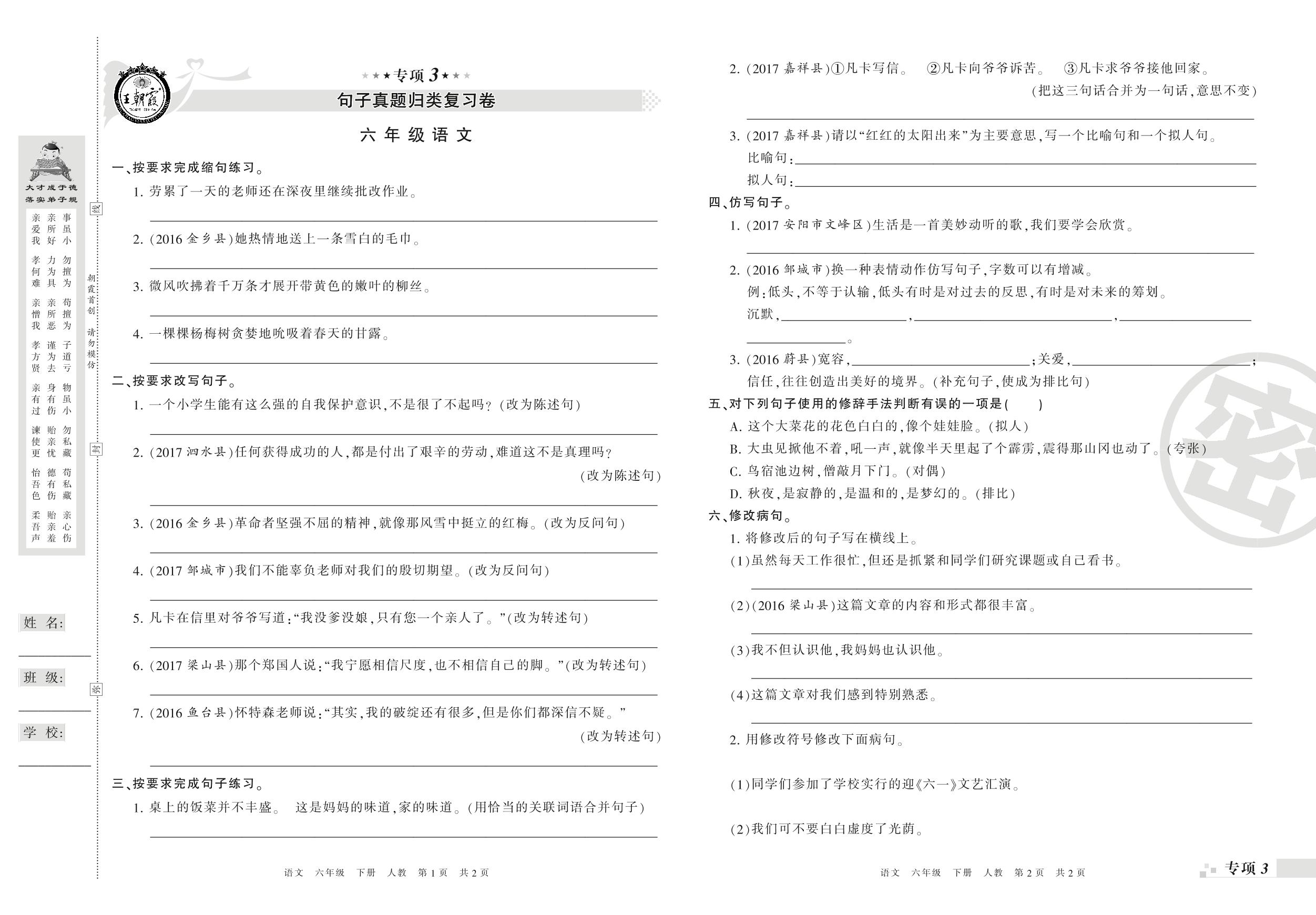 王朝霞期末专项卷——句子、课文内容真题归类复习卷六年级下册语文(人教版)_R21080254227【0】