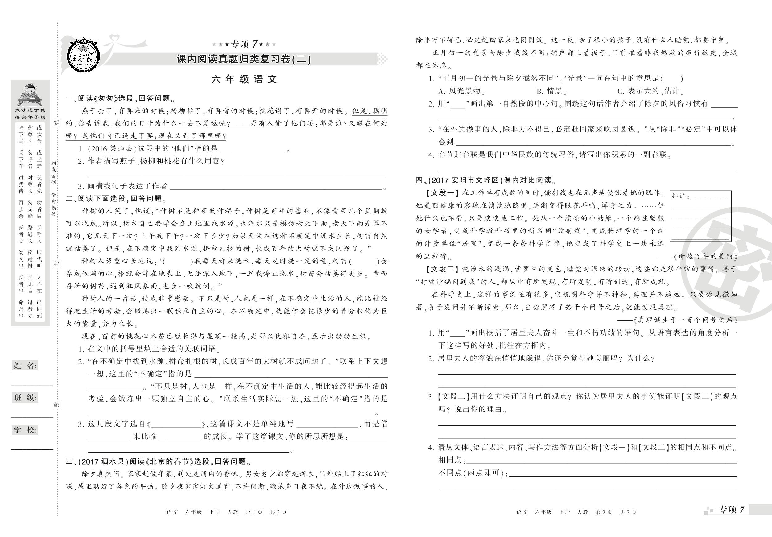 王朝霞期末专项卷——课内阅读(二)、课外阅读与写作真题归类复习卷六年级下册语文(人教版)_R21080254241【0】