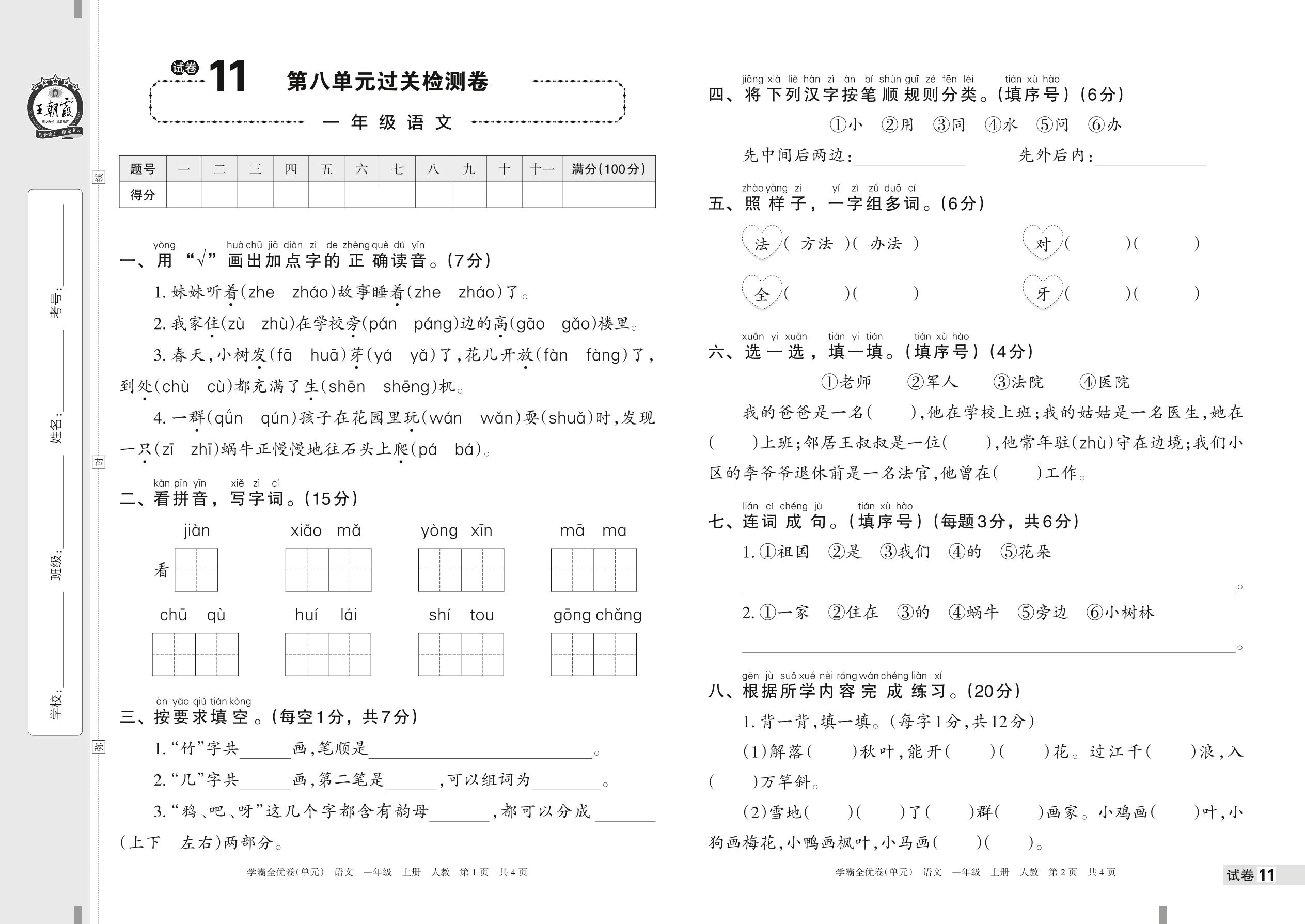 2022上册一年级语文人教版 试卷11 第八单元过关检测卷