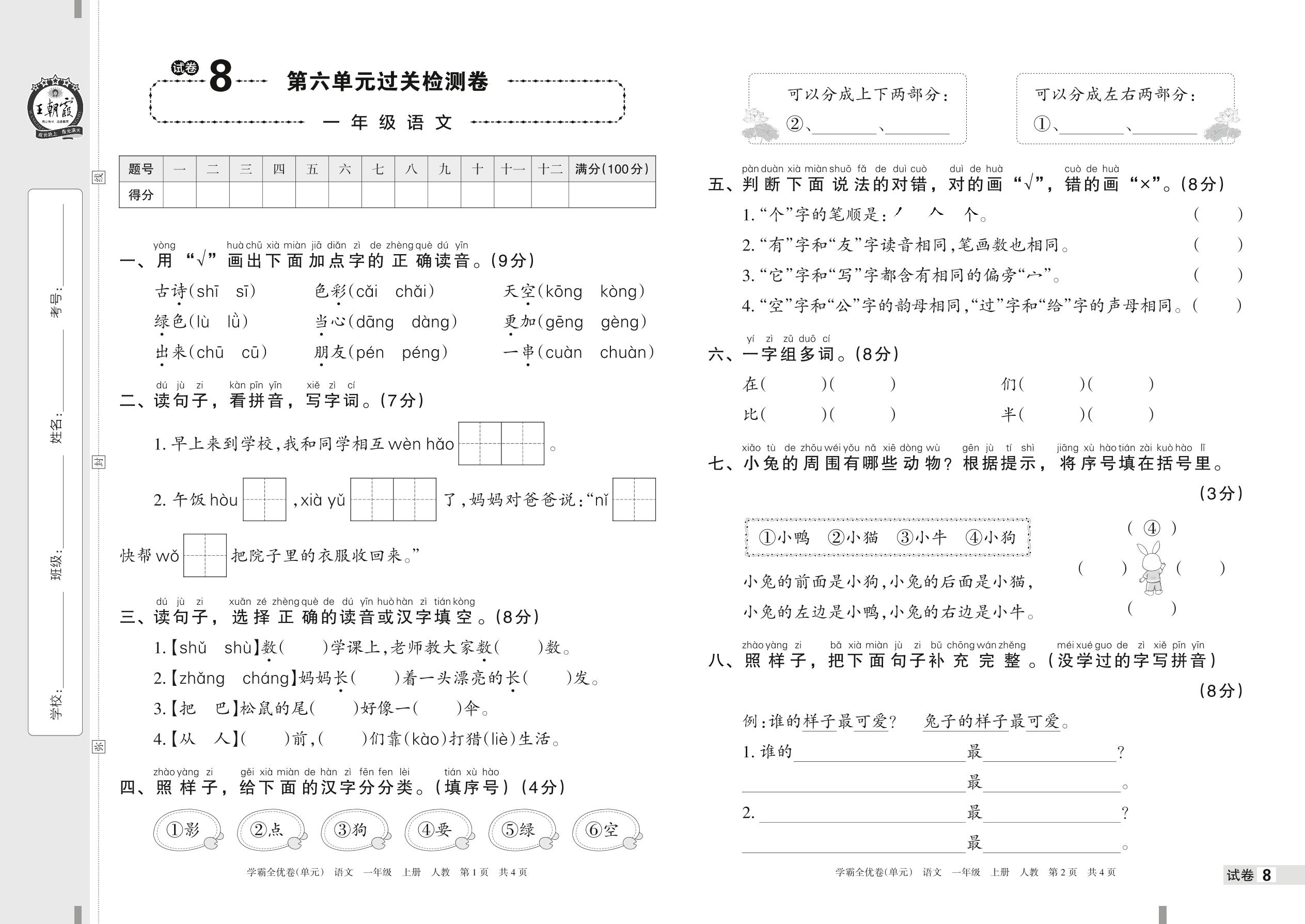 2022上册一年级语文人教版 试卷8 第六单元过关检测卷