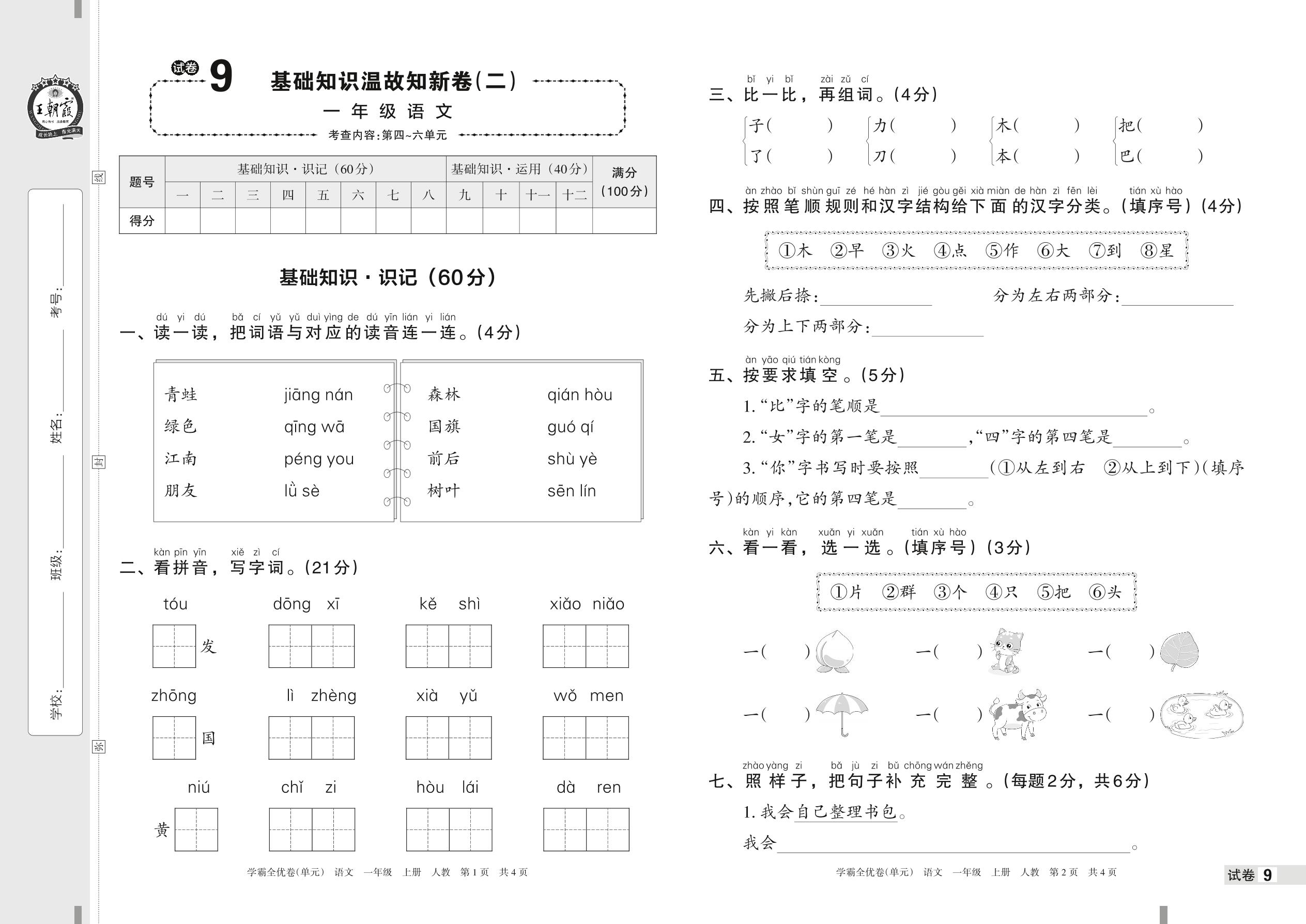 2022上册一年级语文人教版 试卷9 基础知识温故知新卷(二)