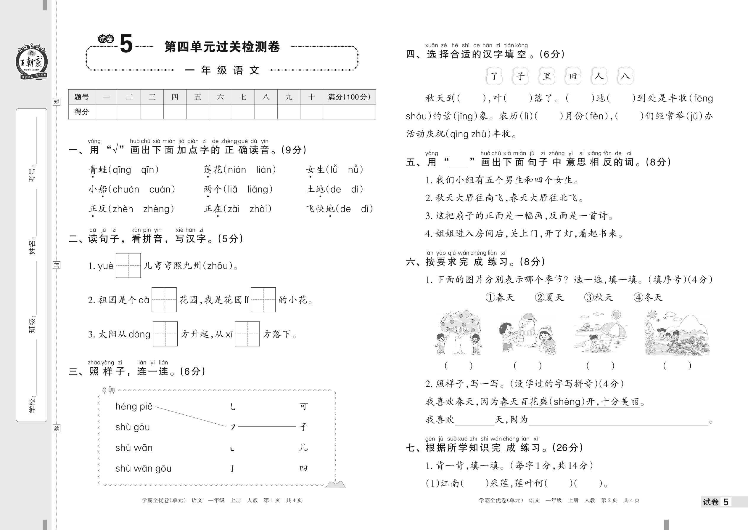 一年级语文人教版上册单元卷