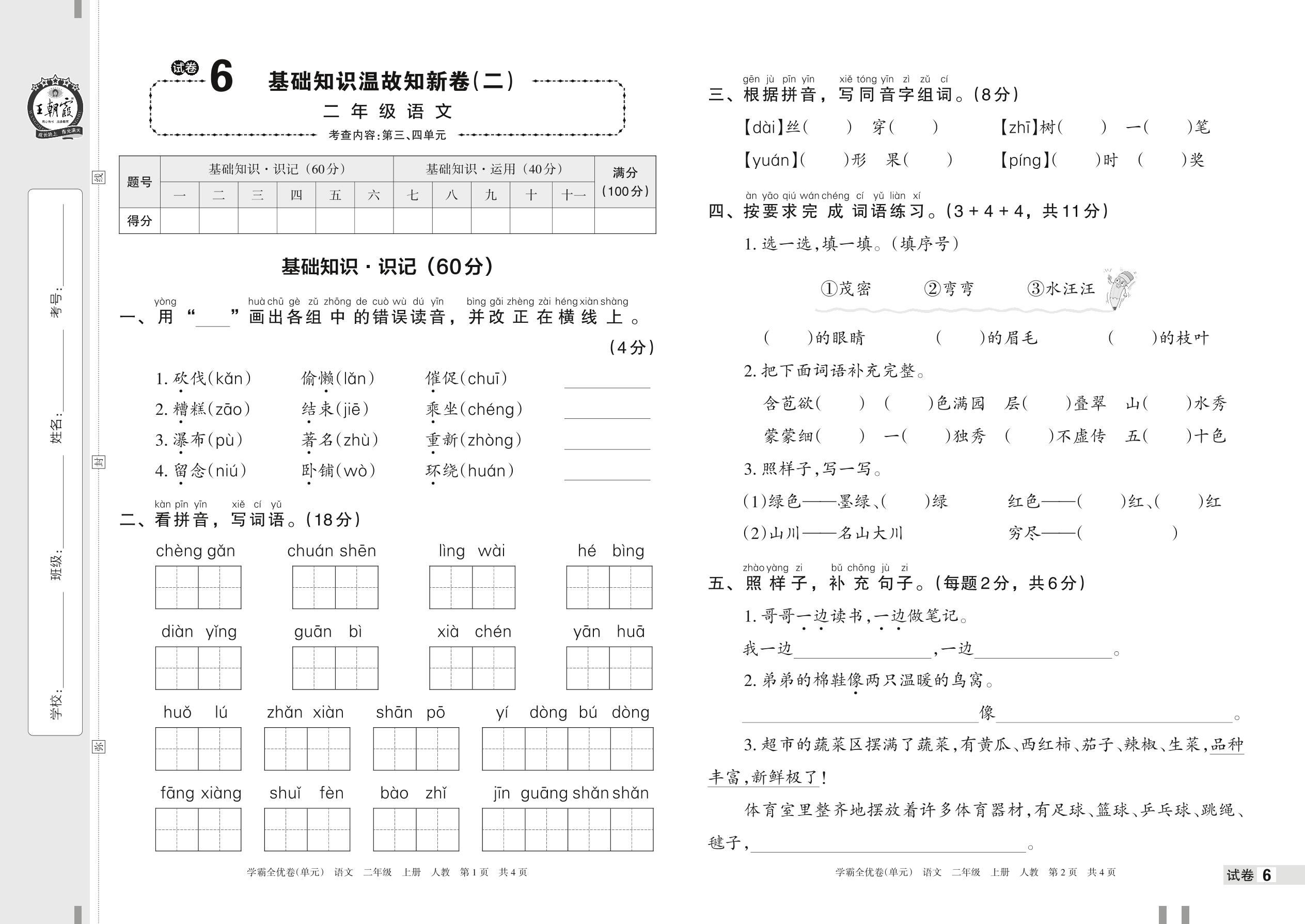 2022上册二年级语文人教版 试卷6 基础知识温故知新卷(二)