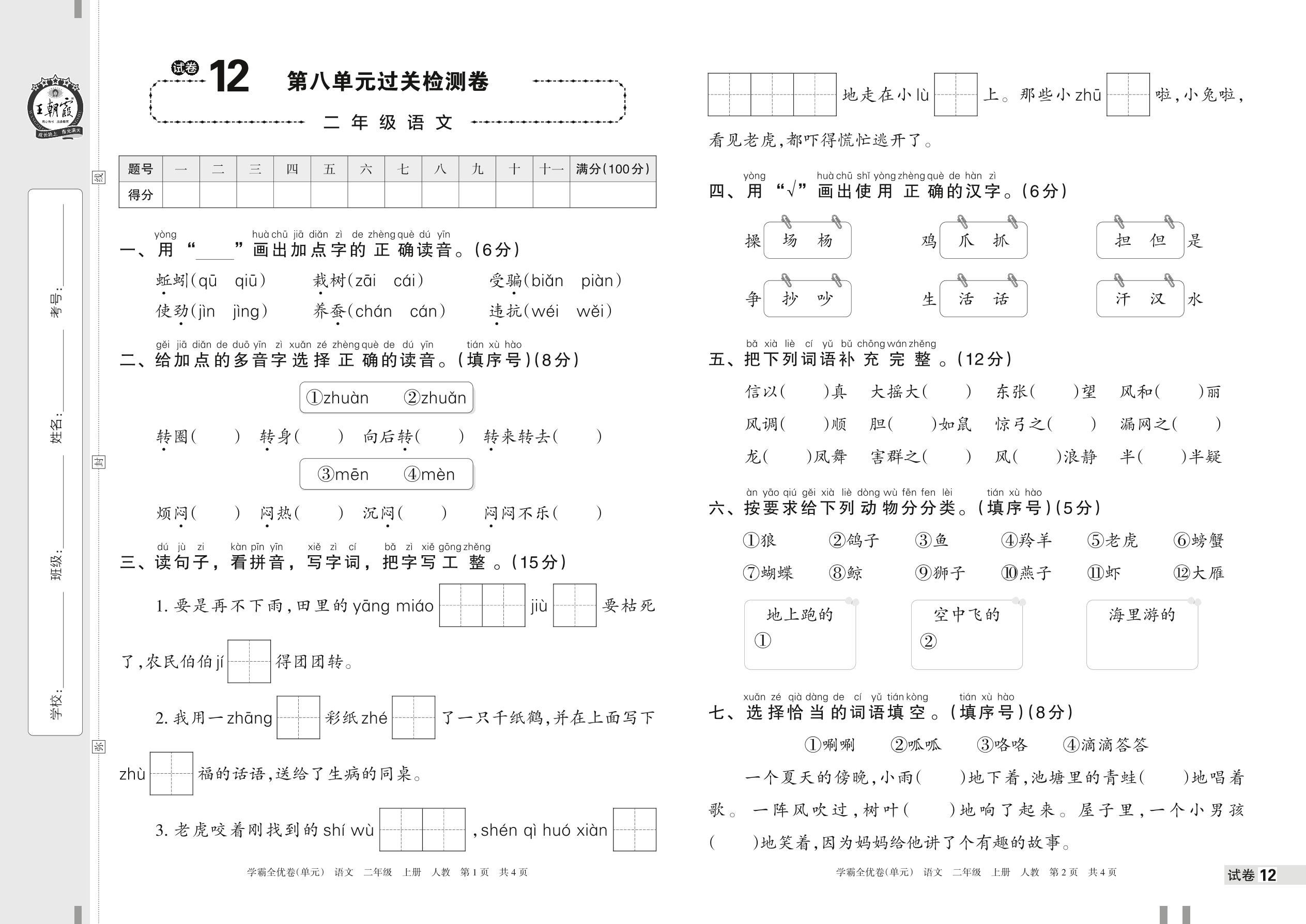 2022上册二年级语文人教版 试卷12 第八单元过关检测卷