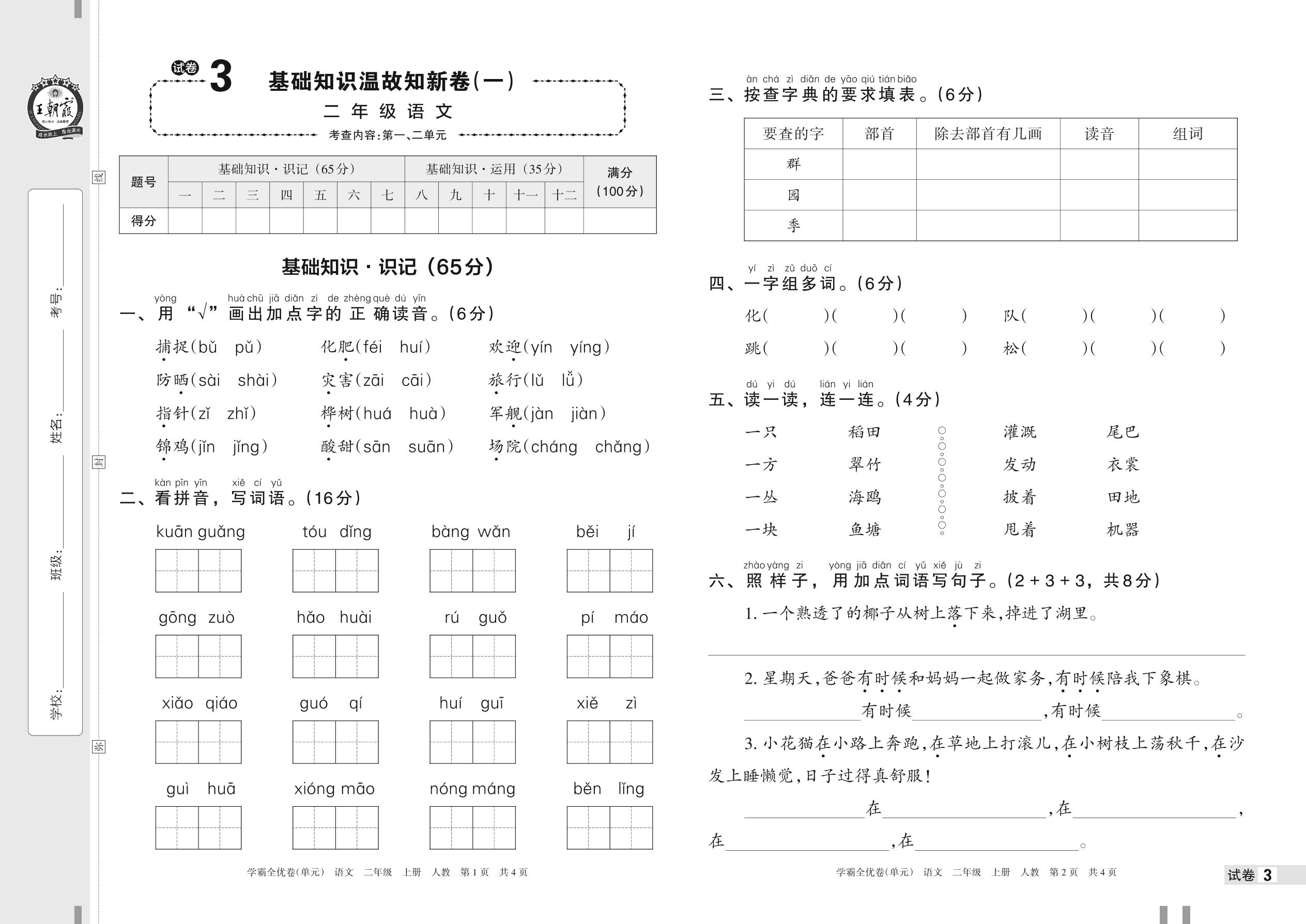 2022上册二年级语文人教版 试卷3 基础知识温故知新卷(一)