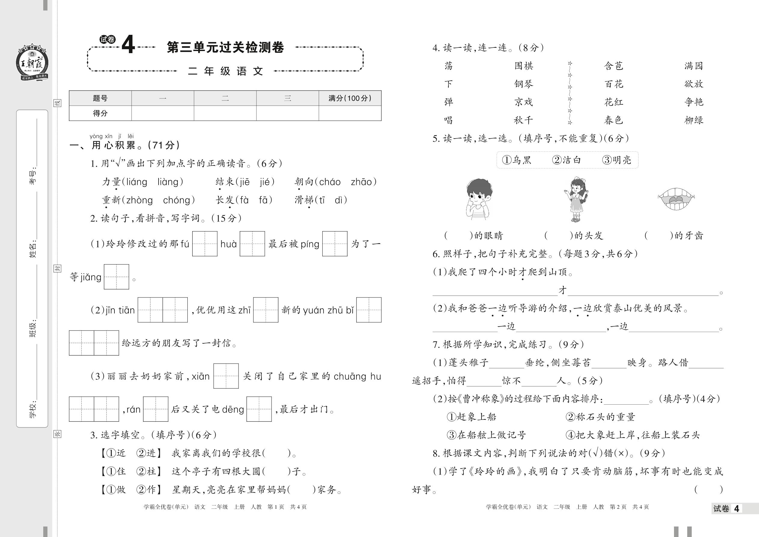 2022上册二年级语文人教版 试卷4 第三单元过关检测卷