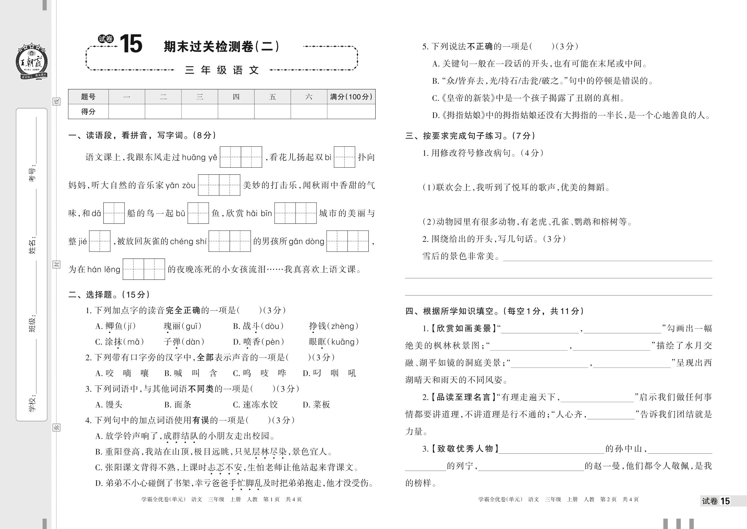 2022上册三年级语文人教版 试卷15 期末过关检测卷(二)