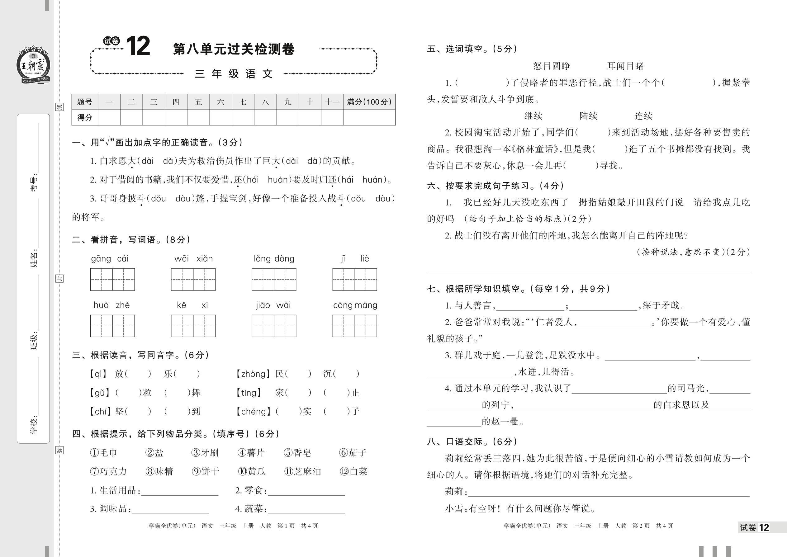 2022上册三年级语文人教版 试卷12 第八单元过关检测卷