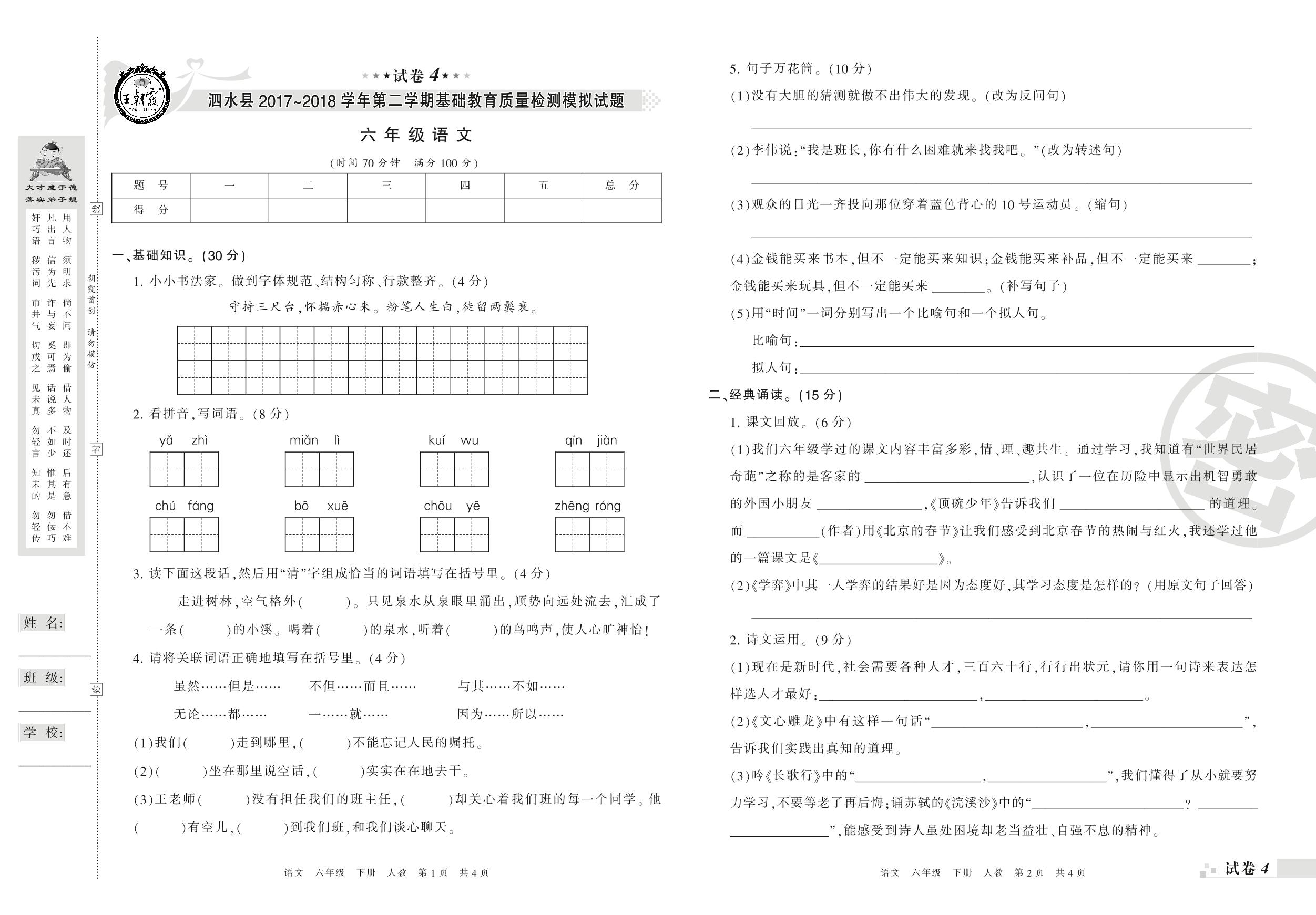 2017-2018学年第二学期济宁市泗水县六年级语文试卷(人教版)【4】