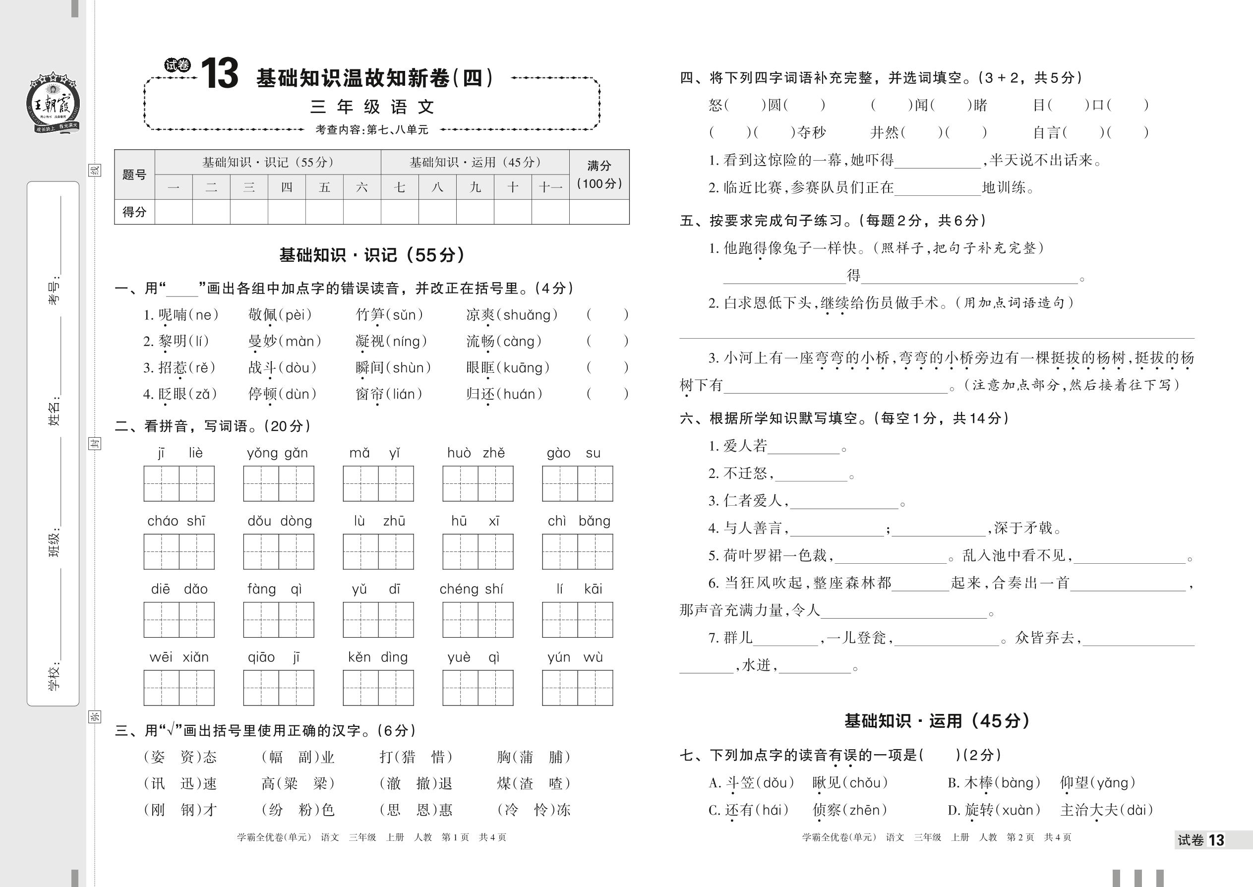 2022上册三年级语文人教版 试卷13 基础知识温故知新卷(四)