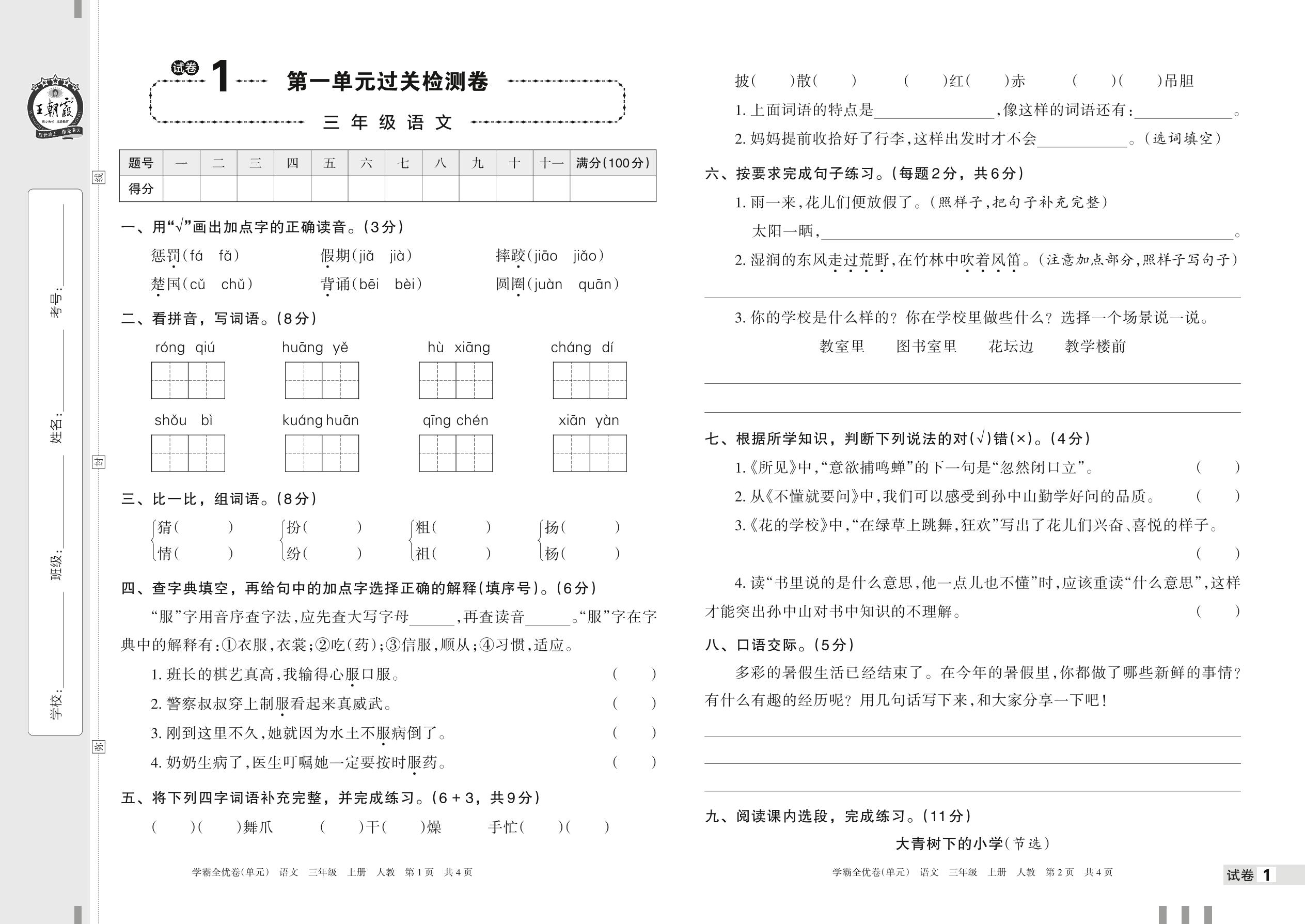 2022上册三年级语文人教版 试卷1 第一单元过关检测卷