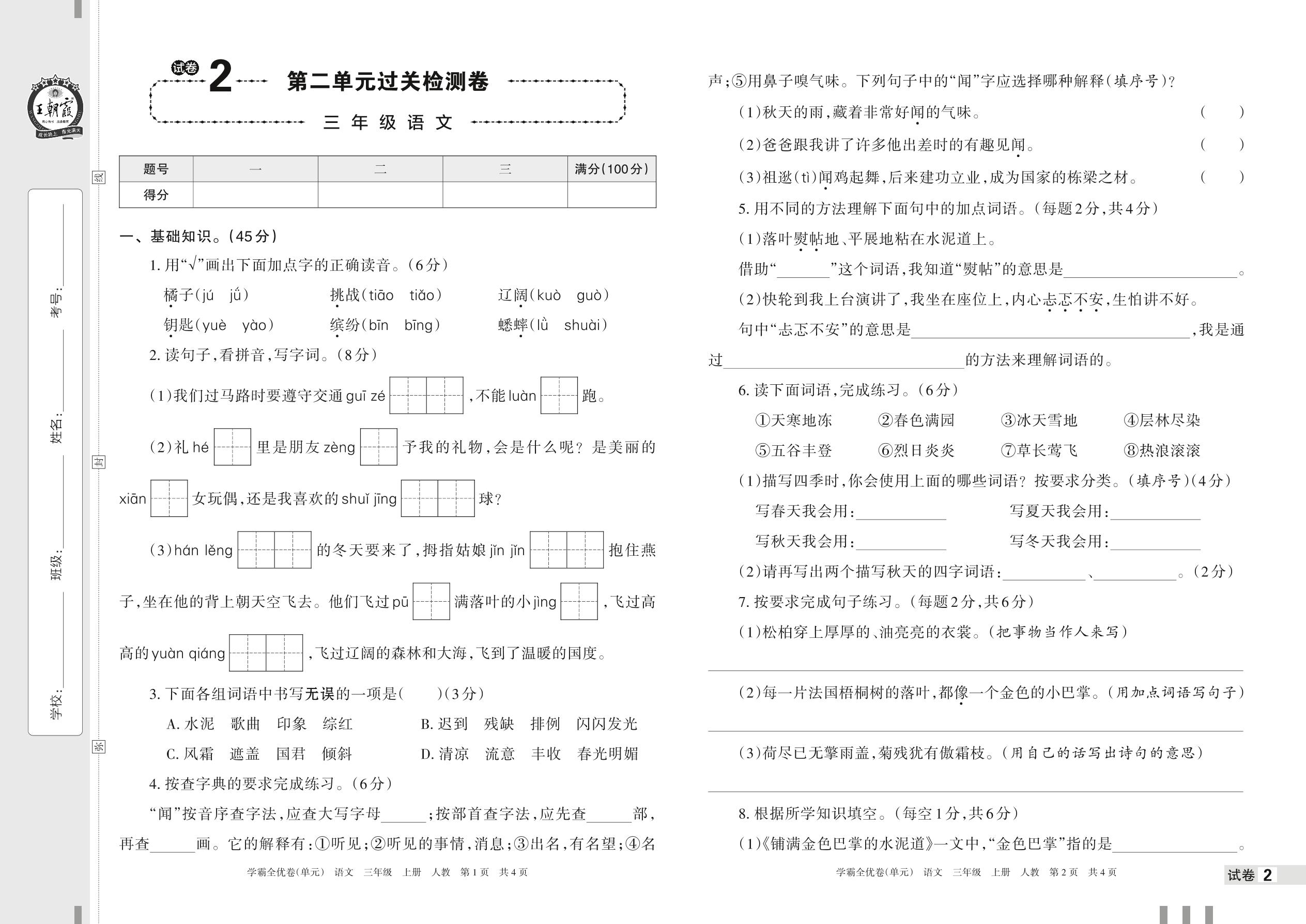 2022上册三年级语文人教版 试卷2 第二单元过关检测卷