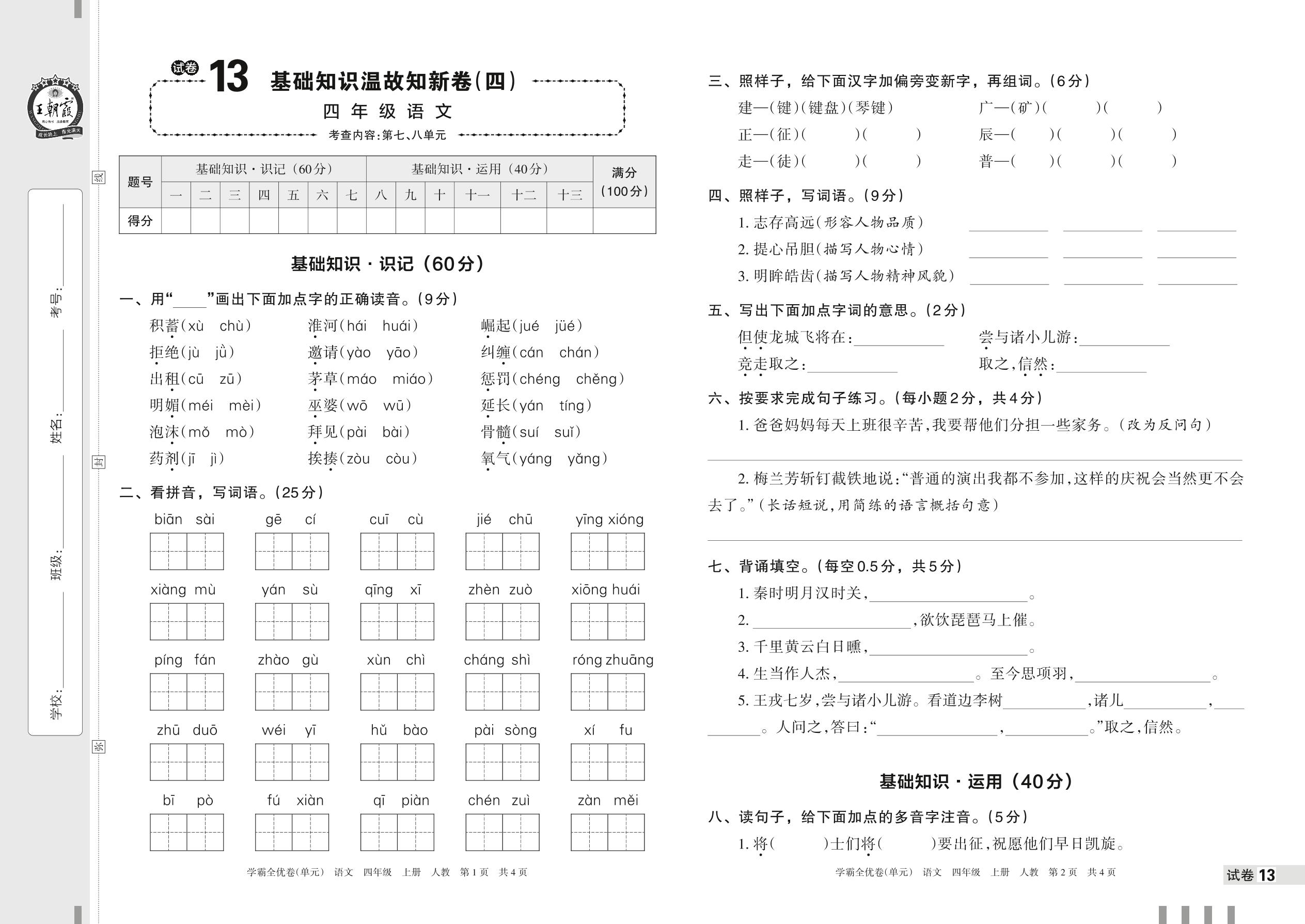 2022上册四年级语文人教版 试卷13 基础知识温故知新卷(四)