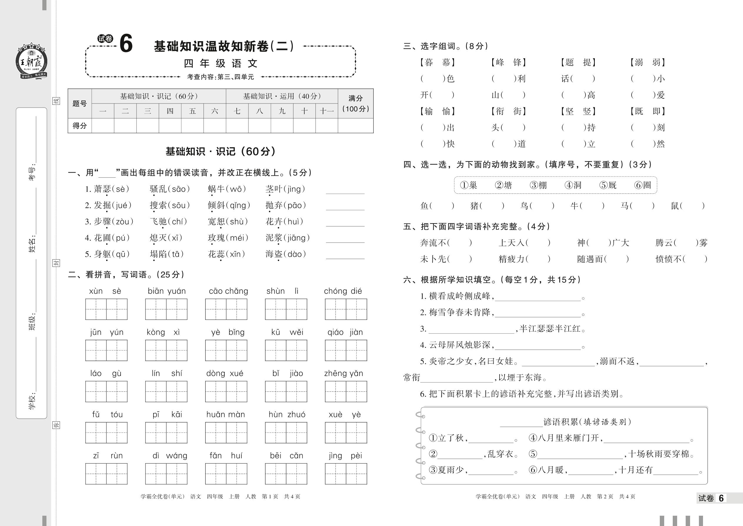 2022上册四年级语文人教版 试卷6 基础知识温故知新卷(二)