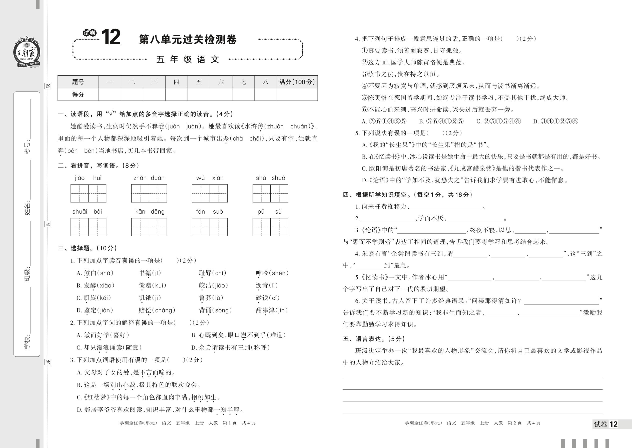 2022上册五年级语文人教版 试卷12 第八单元过关检测卷