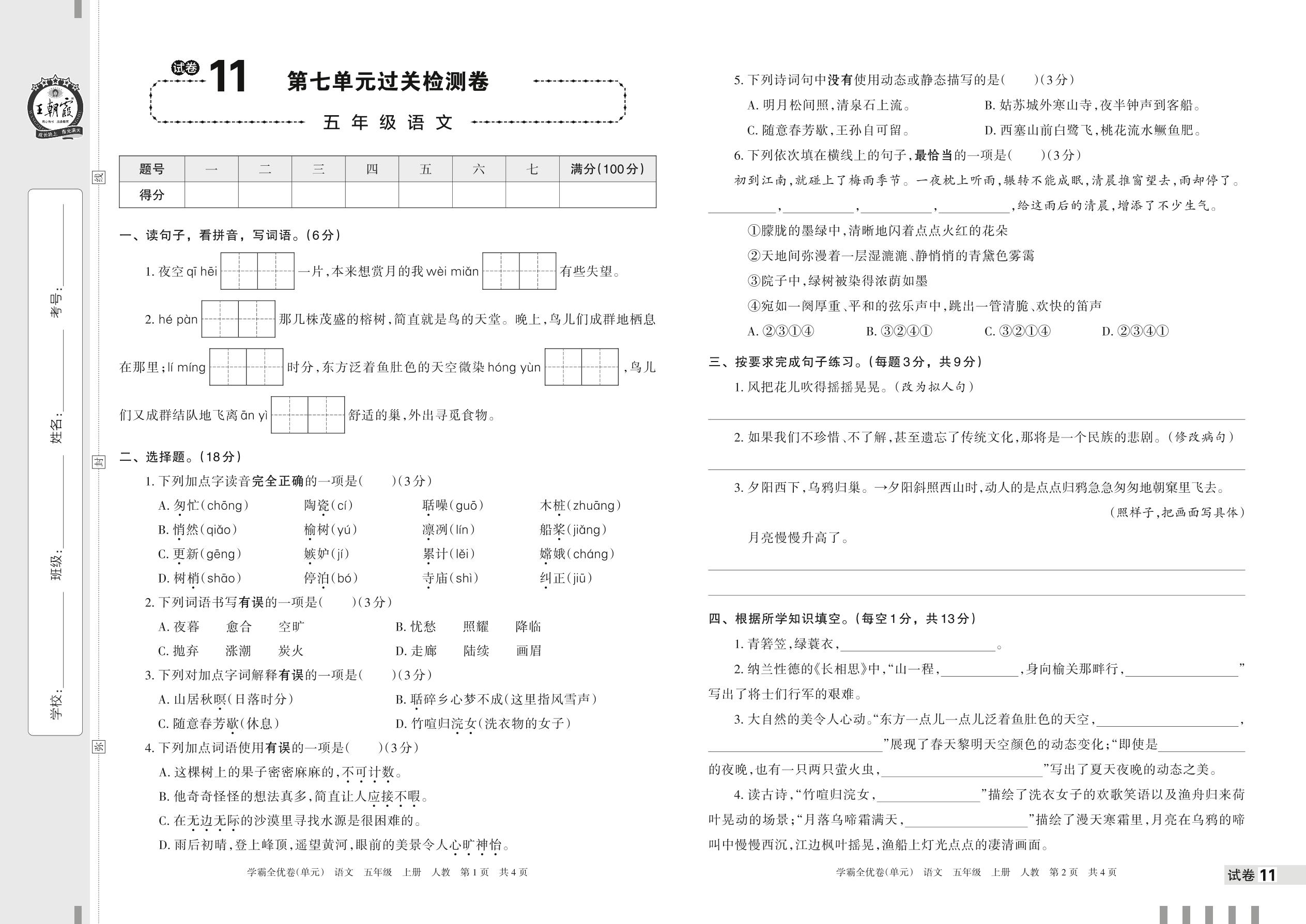 2022上册五年级语文人教版 试卷11 第七单元过关检测卷