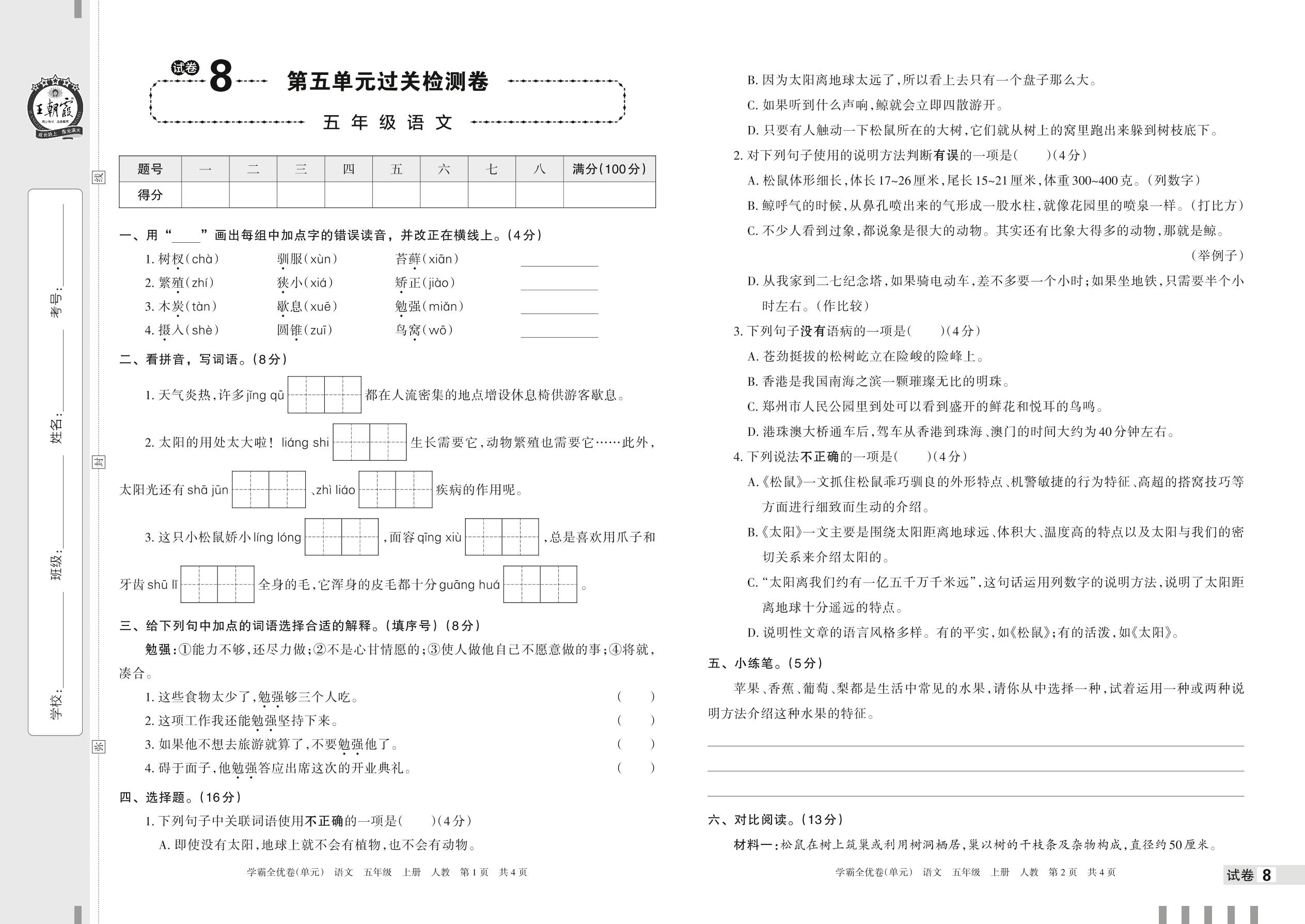 2022上册五年级语文人教版 试卷8 第五单元过关检测卷