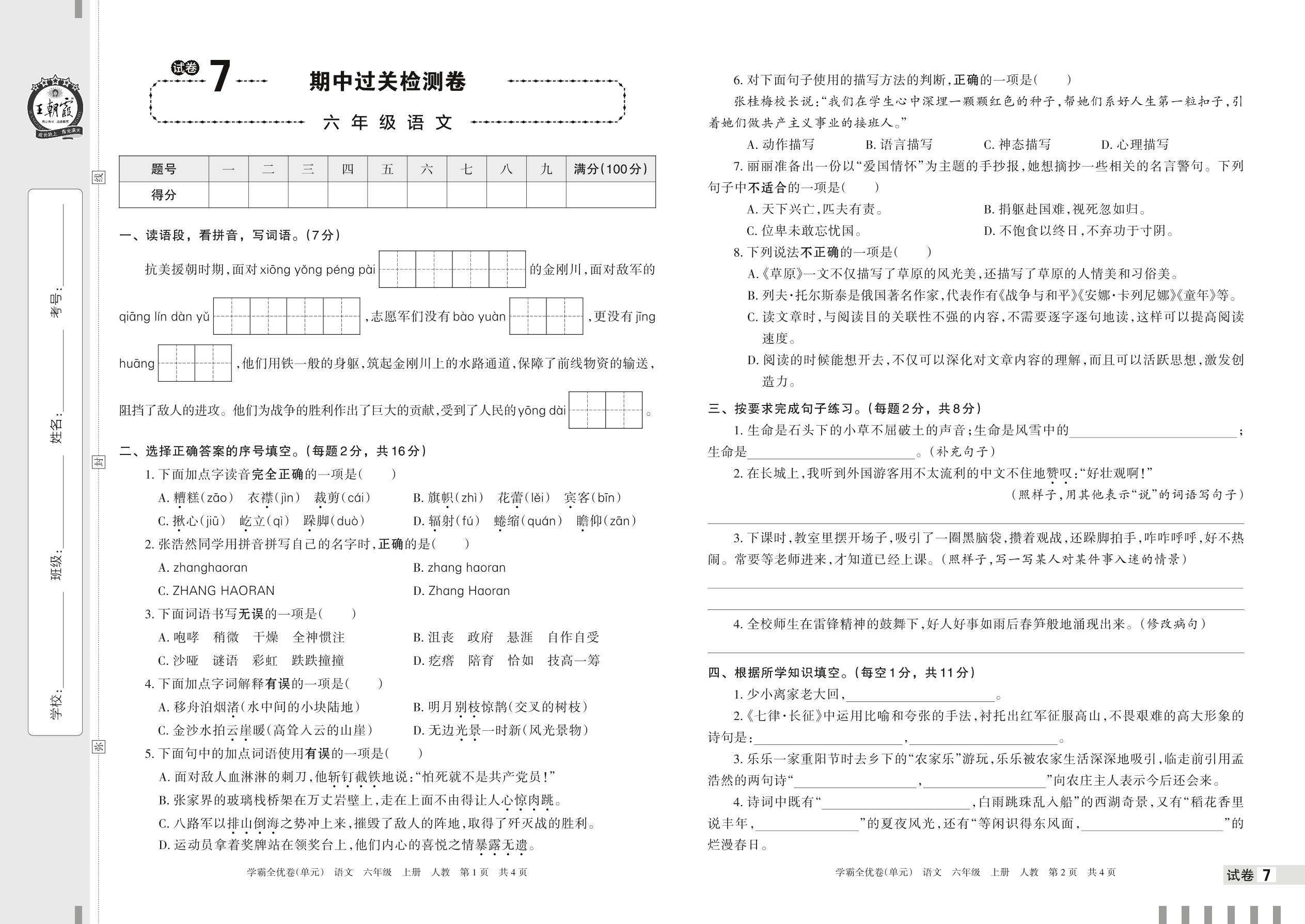 2022上册六年级语文人教版 试卷7 期中过关检测卷