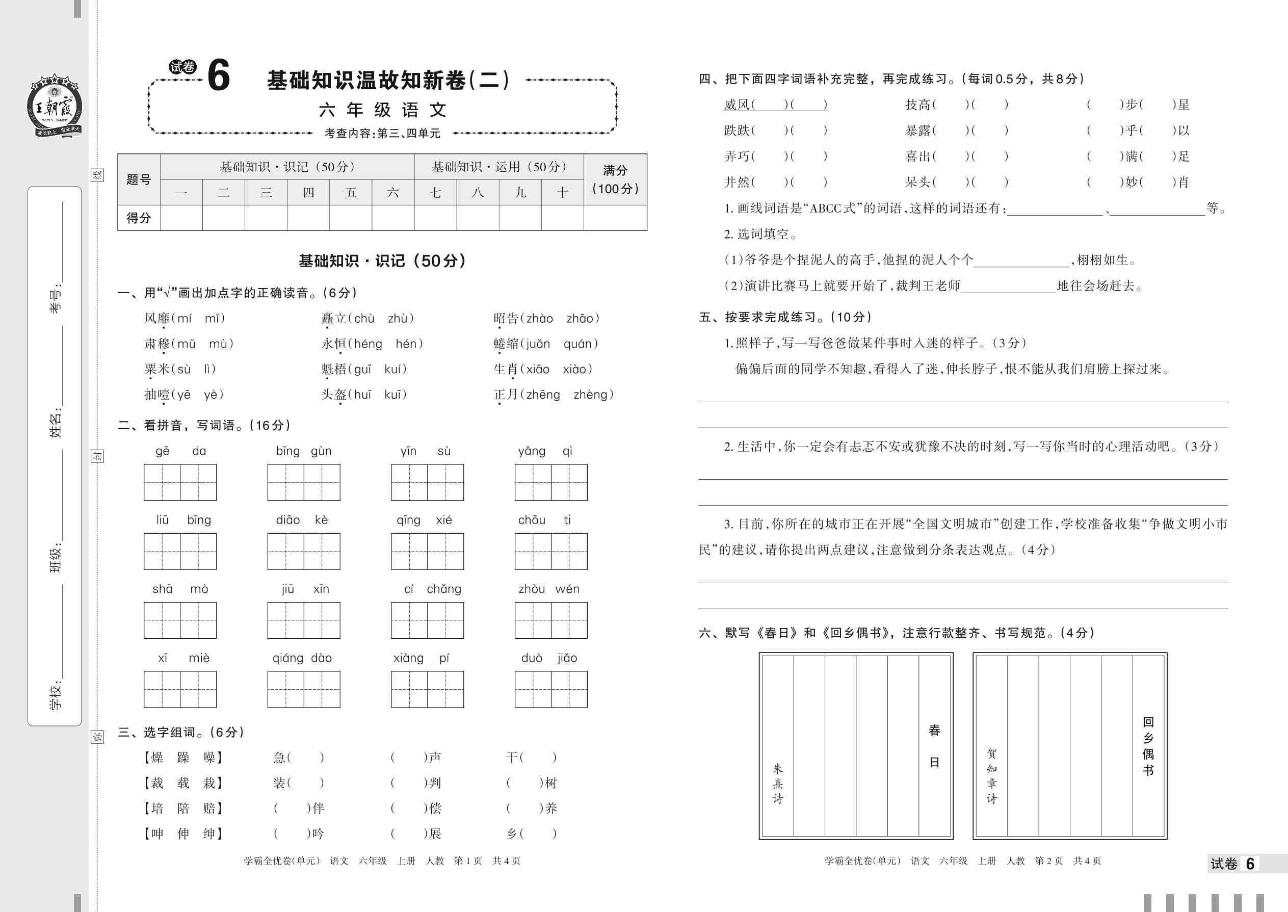 2022上册六年级语文人教版 试卷6 基础知识温故知新卷(二)